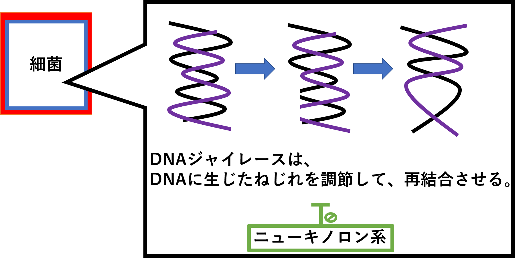 細菌がDNAを合成するためには、DNAジャイレース(トポイソメラーゼU)と呼ばれる酵素が必要です。DNAジャイレース(トポイソメラーゼU)はDNAに生じたねじれを調節して、再結合させる働きをします。