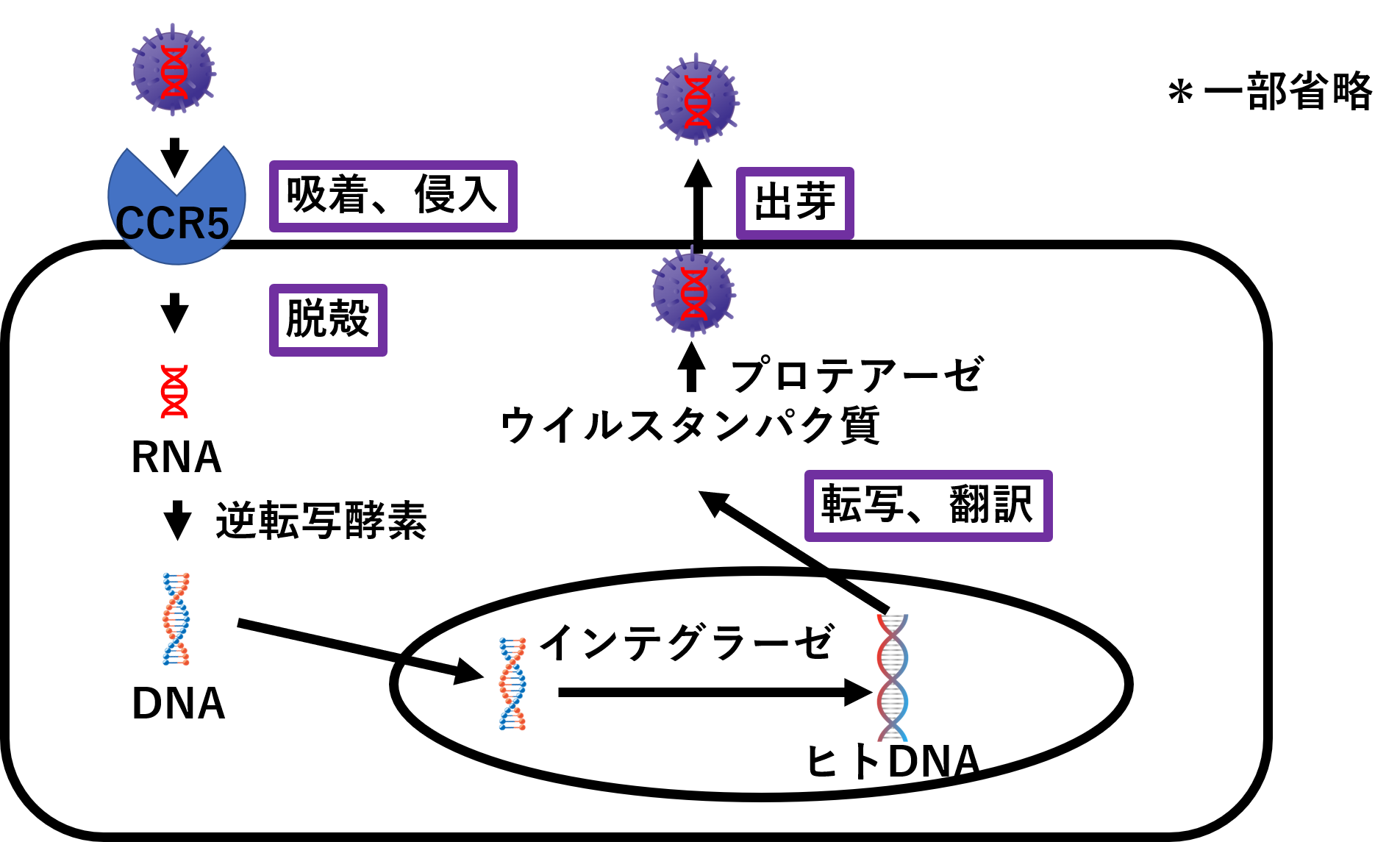 CCR5は、HIVが吸着して侵入する際に結合する受容体です。CCR5阻害薬(ケモカイン受容体5阻害薬)はCCR5にくっつくことで、HIVが結合しにくくします。