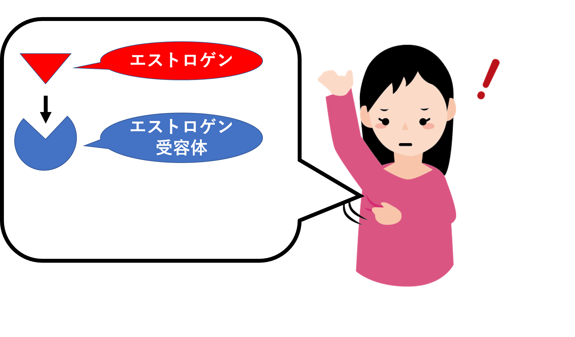エストロゲンが乳がん組織のエストロゲン受容体に作用すると、乳がんを進める原因になると考えられています。抗エストロゲン薬はエストロゲンと拮抗することで効果を示します。