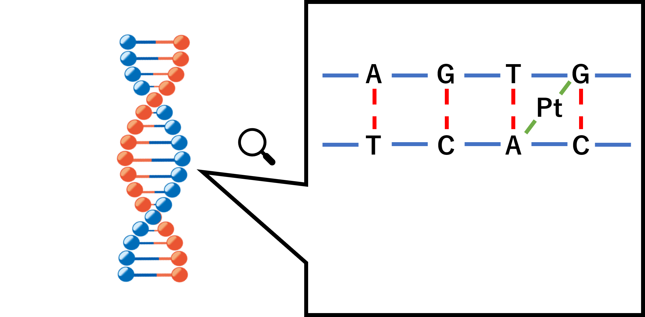 細胞分裂をするには、DNAの二本の線が分離して、1本ずつになることが必要です。白金製剤はアデニンやグアニンに橋をかけることで分離できなくします。その結果、がん細胞をやっつけることができるというメカニズムです。