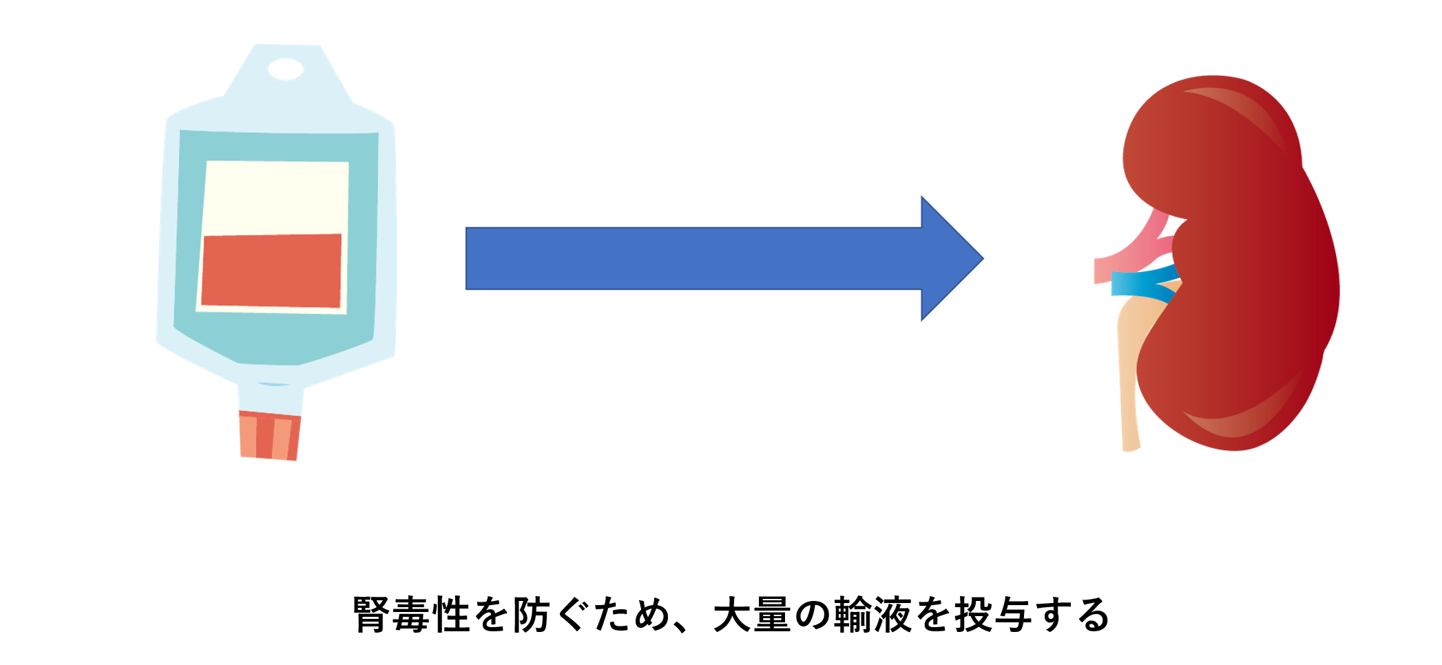 白金製剤は腎毒性が強いため、レジメンにもよりますが前投薬として1000〜2000mlの輸液を入れます。そして、抗がん剤投与後も利尿薬+輸液を投与してハイドレーションをかけます。