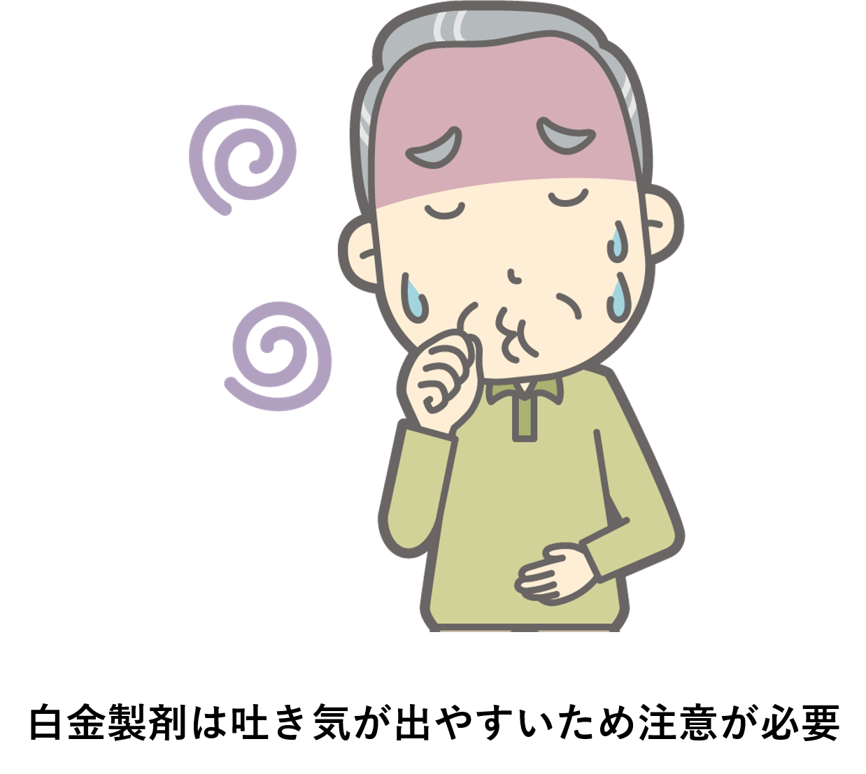 吐き気の副作用が出やすいため、アロキシ(パロノセトロン)などの5-HT3受容体遮断薬を投与して吐き気を防止します。