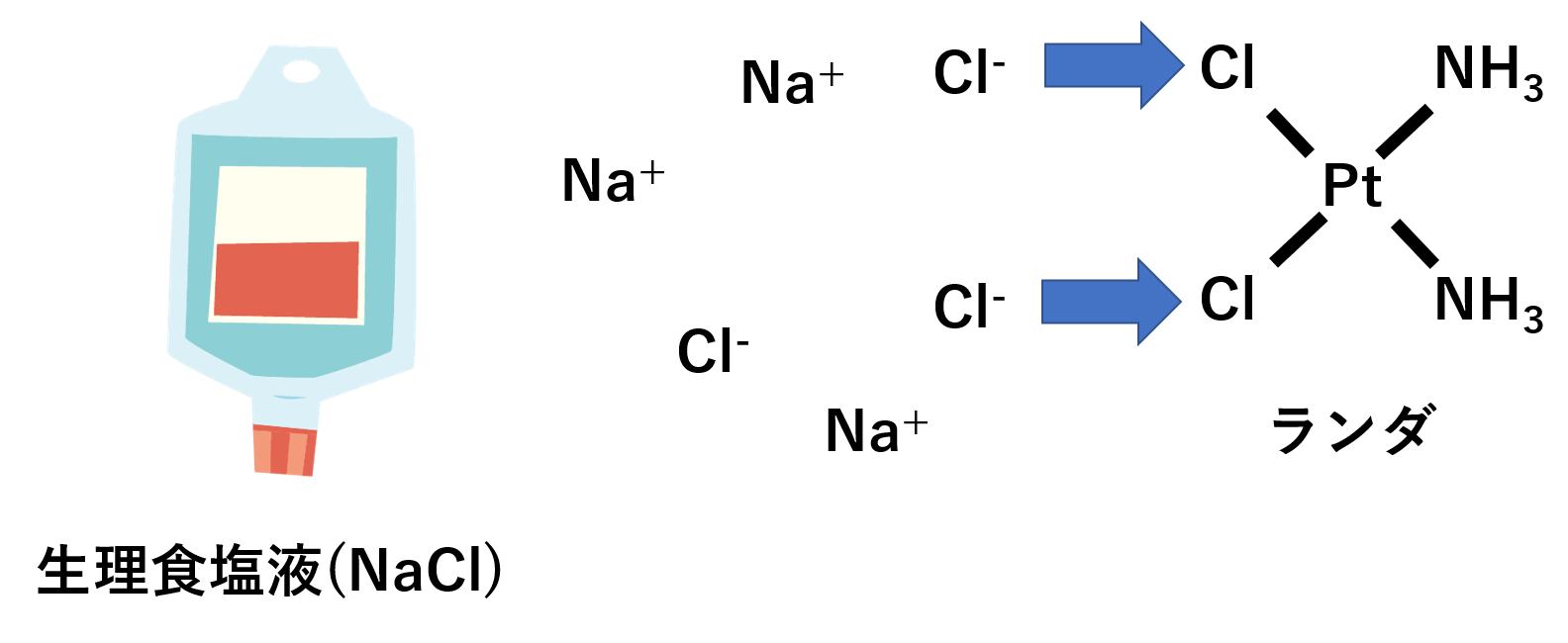 ランダ(シスプラチン)は構造式に塩素(Cl)を含みます。塩素は電気陰性度が高く外れやすく、ランダ(シスプラチン)をクロールイオンの濃度が低い輸液に混ぜると活性が低下するので、基本的に生理食塩液に混ぜます。生理食塩液(NaCl)のから出てくるクロールイオン(Cl-)が、ランダ(シスプラチン)のClに補充されて安定化するイメージを持つと覚えやすいです。