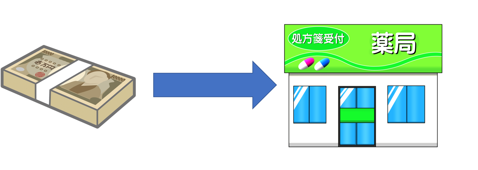 別ページ、保険薬局、レセプトと審査支払機関の流れでは、保険薬局は患者からは一部お金をもらって、残りは保険からお金をもらうという話をしました。