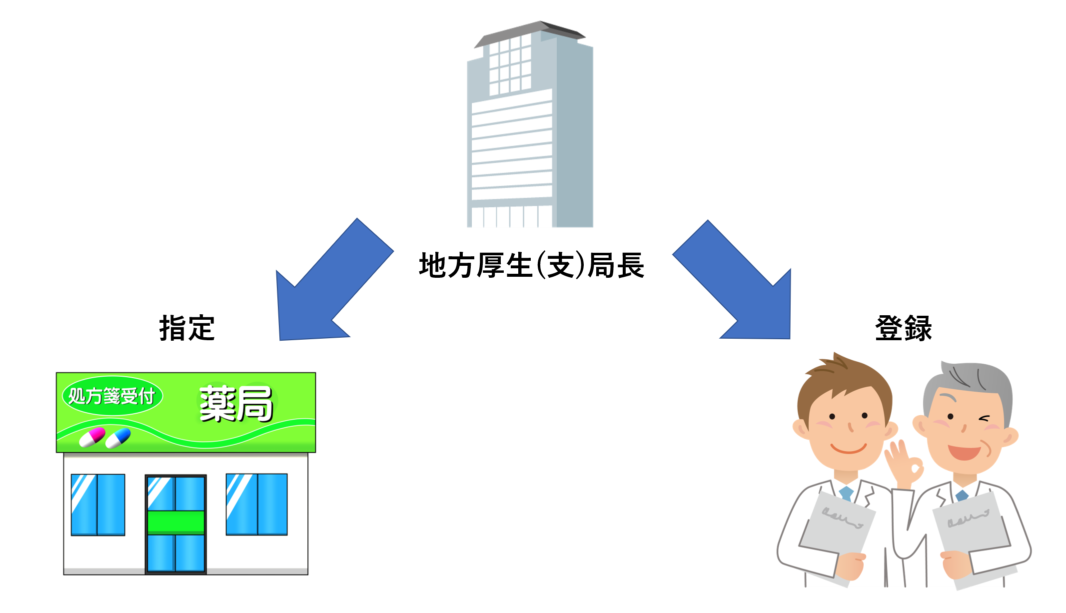 保険薬局が院外処方箋を取り扱うためには、薬局の開設許可だけでなく、地方厚生(支)局長から保険薬局の指定を受けなければなりません。地方厚生(支)局は、厚生労働省の支局です。ミニ厚生労働省とイメージしてもらえればよいと思います。