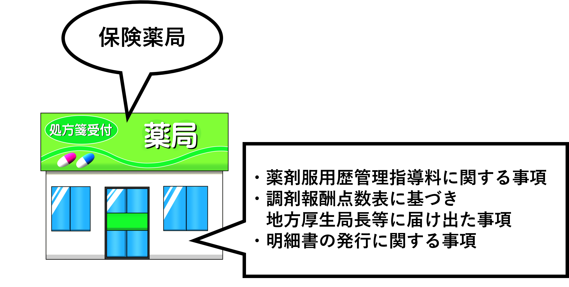 先ほどの薬担の事項の中に、掲示という項目がありました。さらっと流しがちですが、まず保険薬局として指定を受けている場合は「保険薬局」であることを掲示しなければならないとされています。