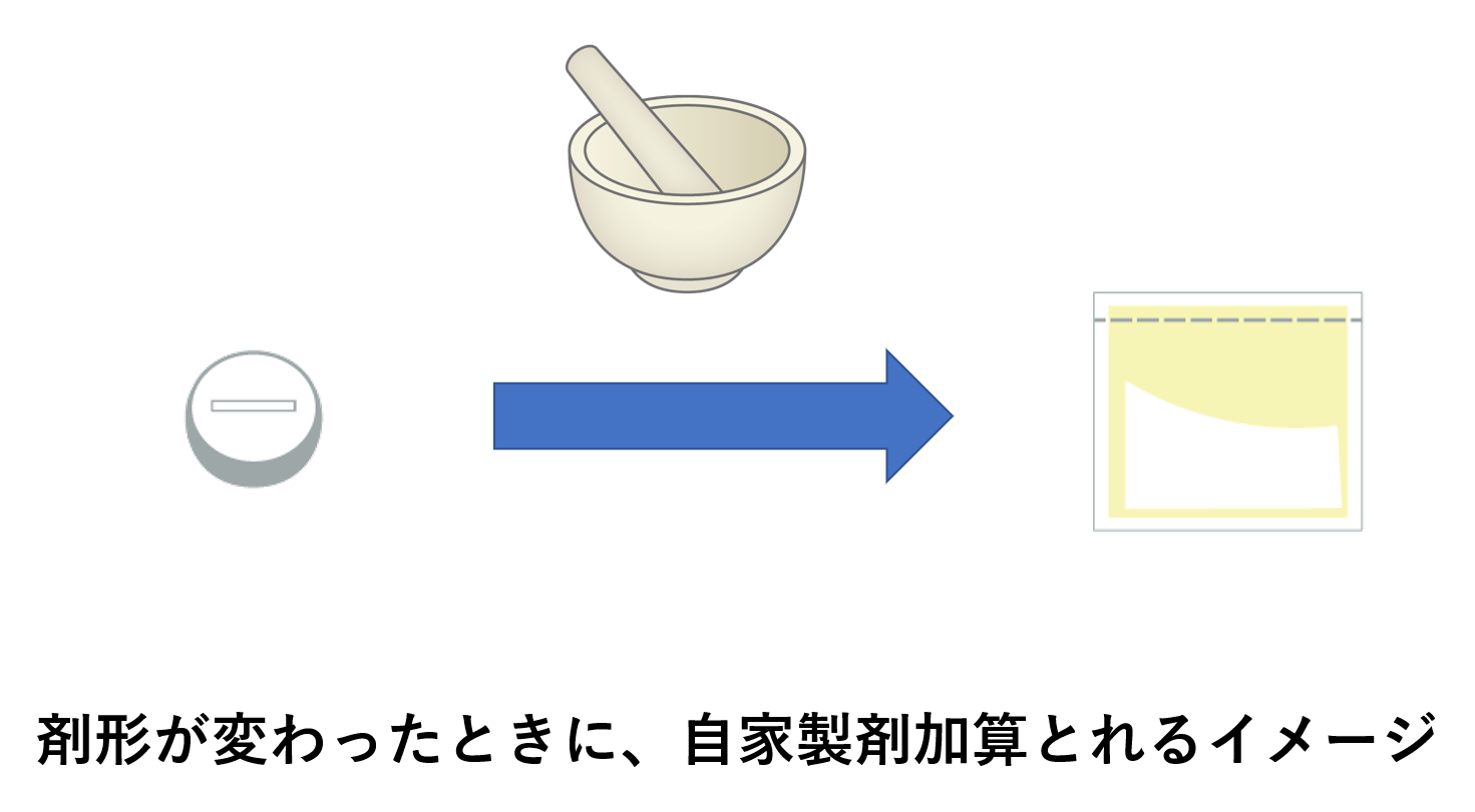 市販されている医薬品の剤形では対応できないとき、医師の指示に基づいて服用できるように工夫を行ったときにとれる加算です。ここでいう工夫は、添加剤の使用、ろ過、加温、滅菌などがあります。一番身近な例では、錠剤を粉砕して散剤にするなど、剤形が変わったときに算定できるイメージになります。