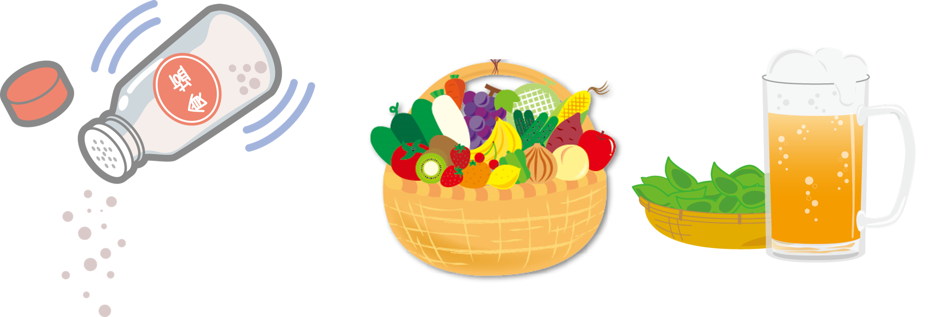 野菜や果物はカリウムをより多く含んでいることが多いです。カリウムは食塩(NaCl)のナトリウムを対外に排泄させやすくする作用があります。ただし、医師から食事制限がかけられている場合があるので注意が必要です。例えば、腎機能が悪いとカリウムは増えすぎてしまうので、制限がかけられていることがあります。