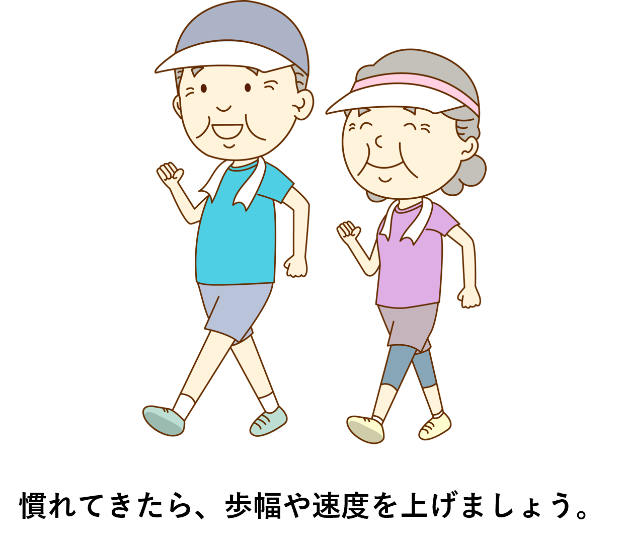 できたら、ウォーキングは歩幅を広くして早歩きすることが理想ですが、何も運動していないときと比べたら、ゆっくり歩くだけでも効果はあります。慣れてきたら、徐々に歩幅や速度をあげていきましょう。他のページの運動療法でもさんざん言っていますが、運動する時間がなければ、通勤時間を早歩きしましょう。