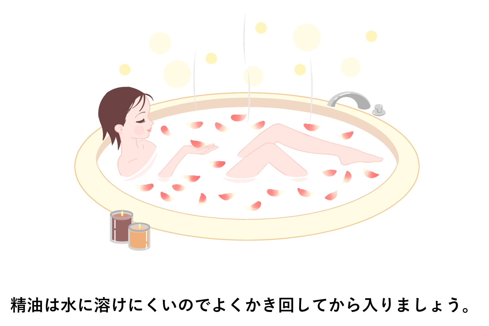 浴槽に5滴以下の精油を入れます。リラックスしたい時は、お湯の温度は38℃くらいにして長時間つかります。リフレッシュしたい時は、40℃くらいにして短時間つかります。