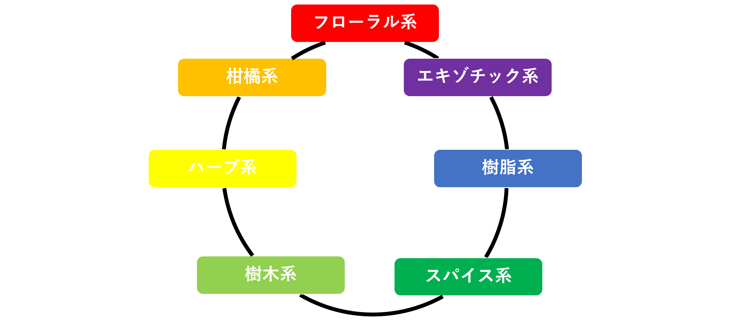 同じ系統の香りは、混ぜるときにも相性が良いと言われています。図で言うと、隣同士の精油は相性がよいでしょう。