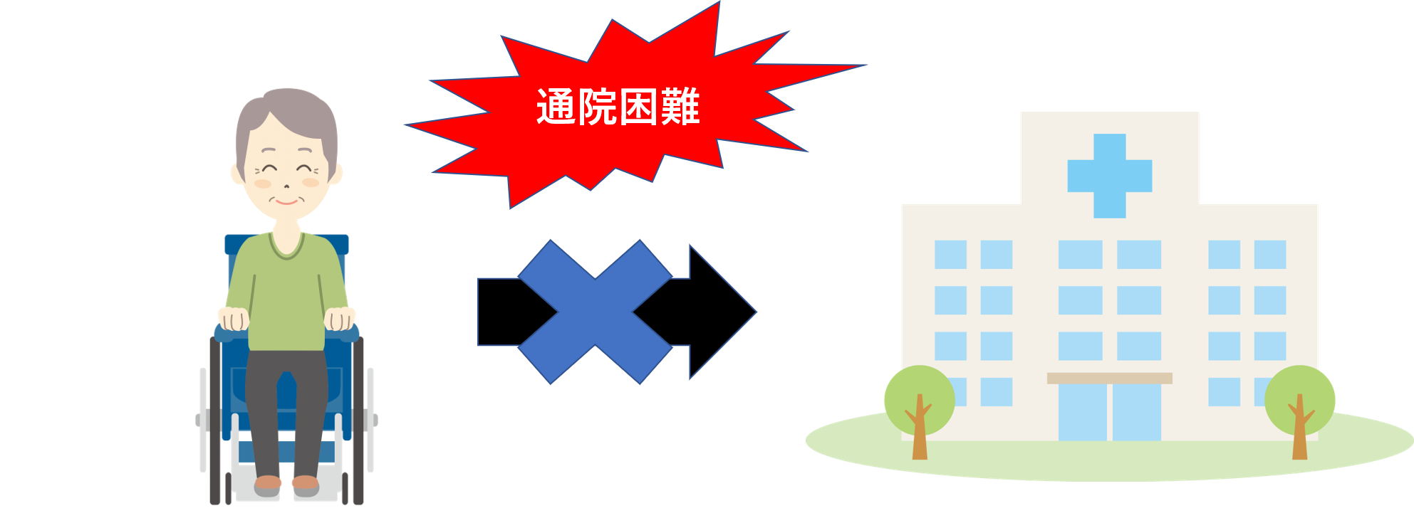 要するになんらかの形で通院困難な方が多いと言えます。ここでいう通院困難の基準の例として、独歩で家族等の助けを借りずに通院ができないことなどがあげられます。