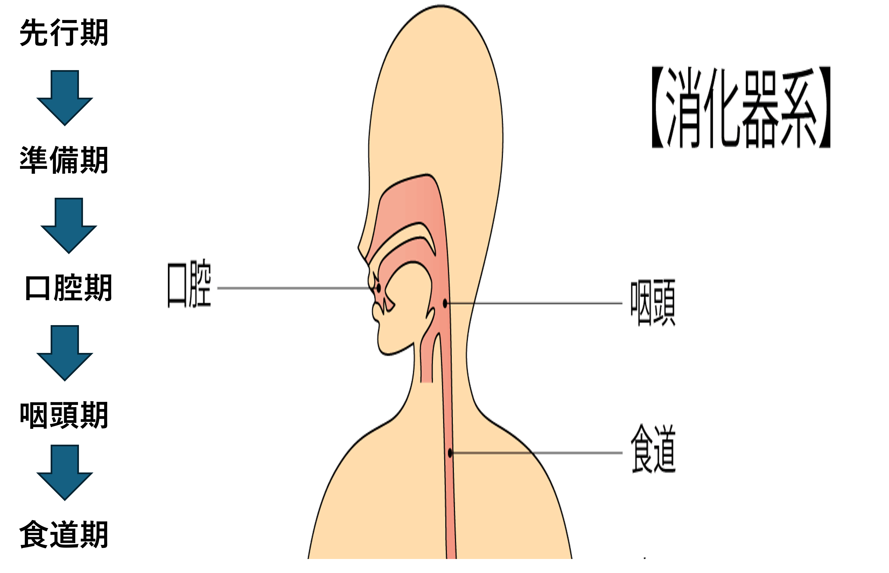 食事を当たり前のように嚥下していますが、嚥下をするには以下のようなステップを踏んでいます。