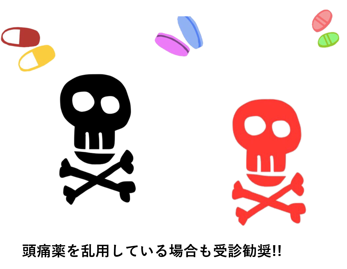 などがあります。その他にも鎮痛薬を定期的に1か月間に10日以上使っている場合は、薬物乱用による頭痛の可能性があるため受診勧奨をした方が良いです。