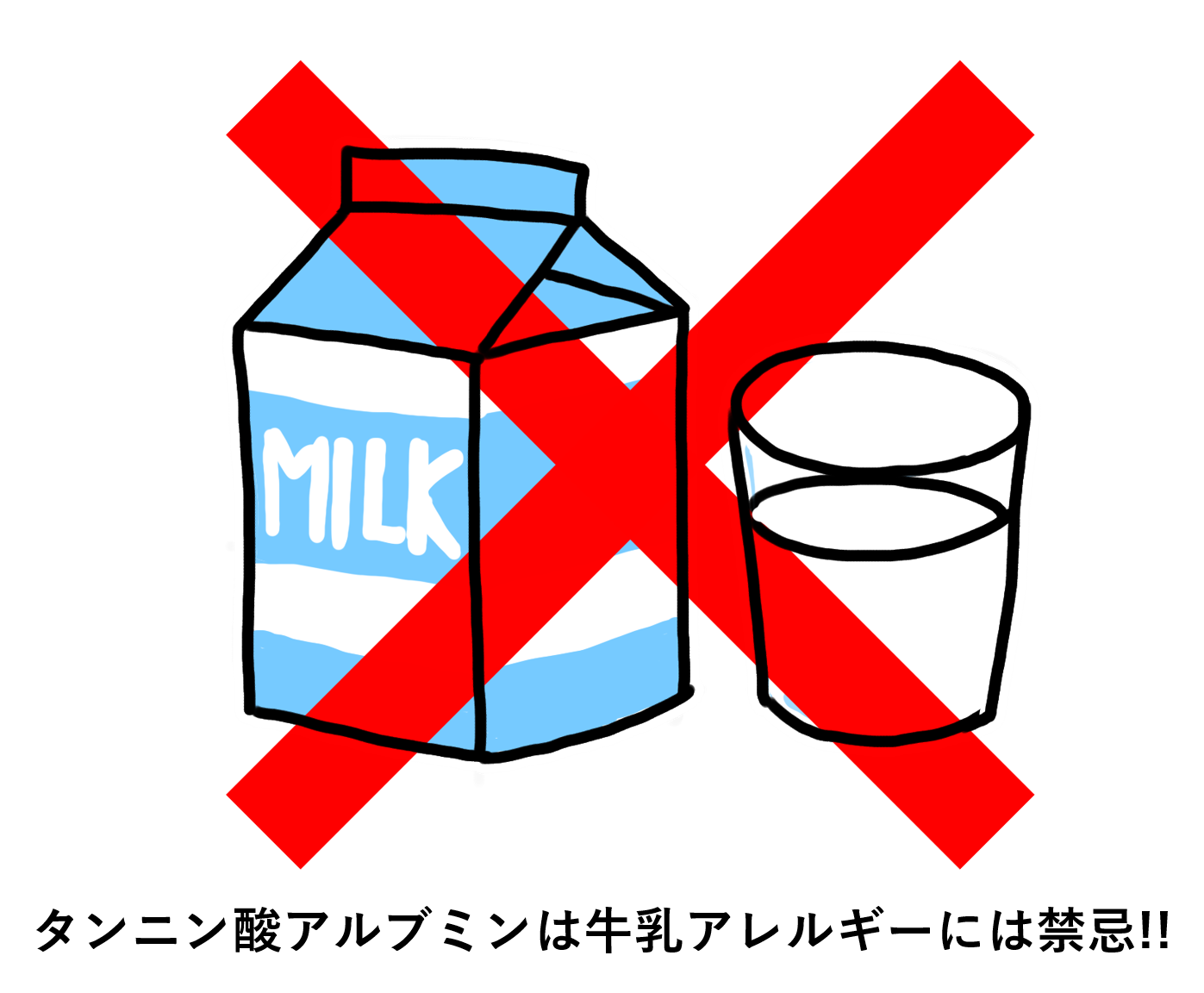 タンニン酸アルブミンは牛乳アレルギーのある患者には禁忌です。