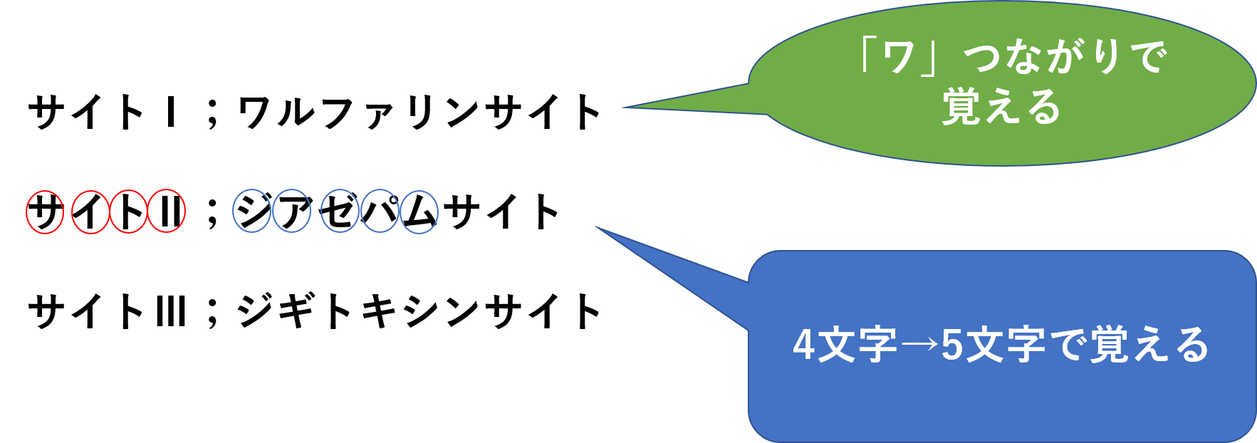 サイトUは、サイトUは4文字、ジアゼパムは5文字と文字数つながりで覚えましょう。