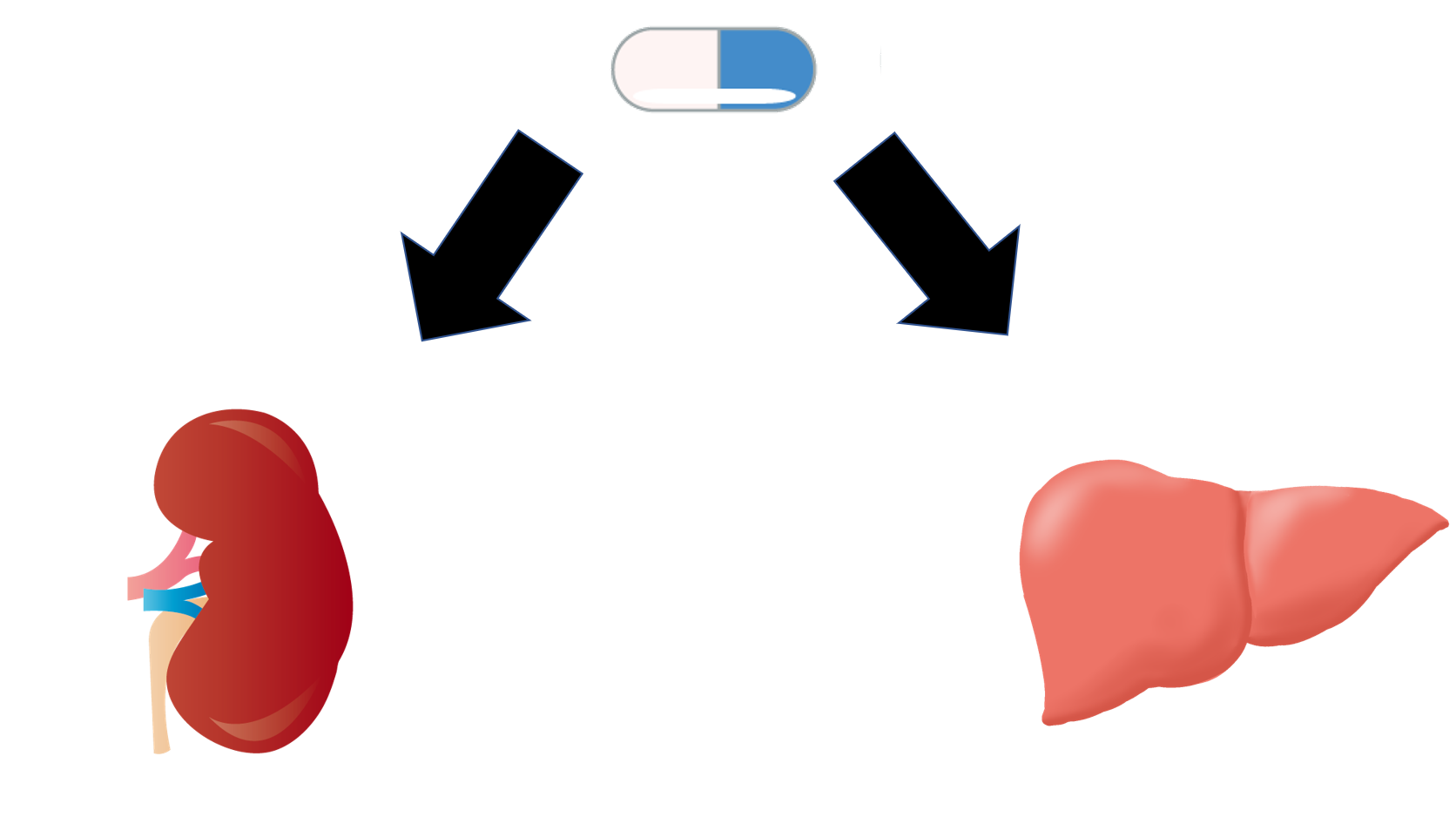 前回の薬物動態、腎クリアランスCLrの計算式では、CLtot=CLr+CLhであらわされ腎臓と肝臓が大きく関わっているという話をしました。薬が代謝や排泄されるにあたって、その薬が腎排泄なのか、肝代謝なのかというのはとても大切な話です。例えば腎機能が落ちている患者に、腎排泄の薬を投与すると、なかなか排泄されず血中濃度が高まり副作用などの危険性が出てきます。