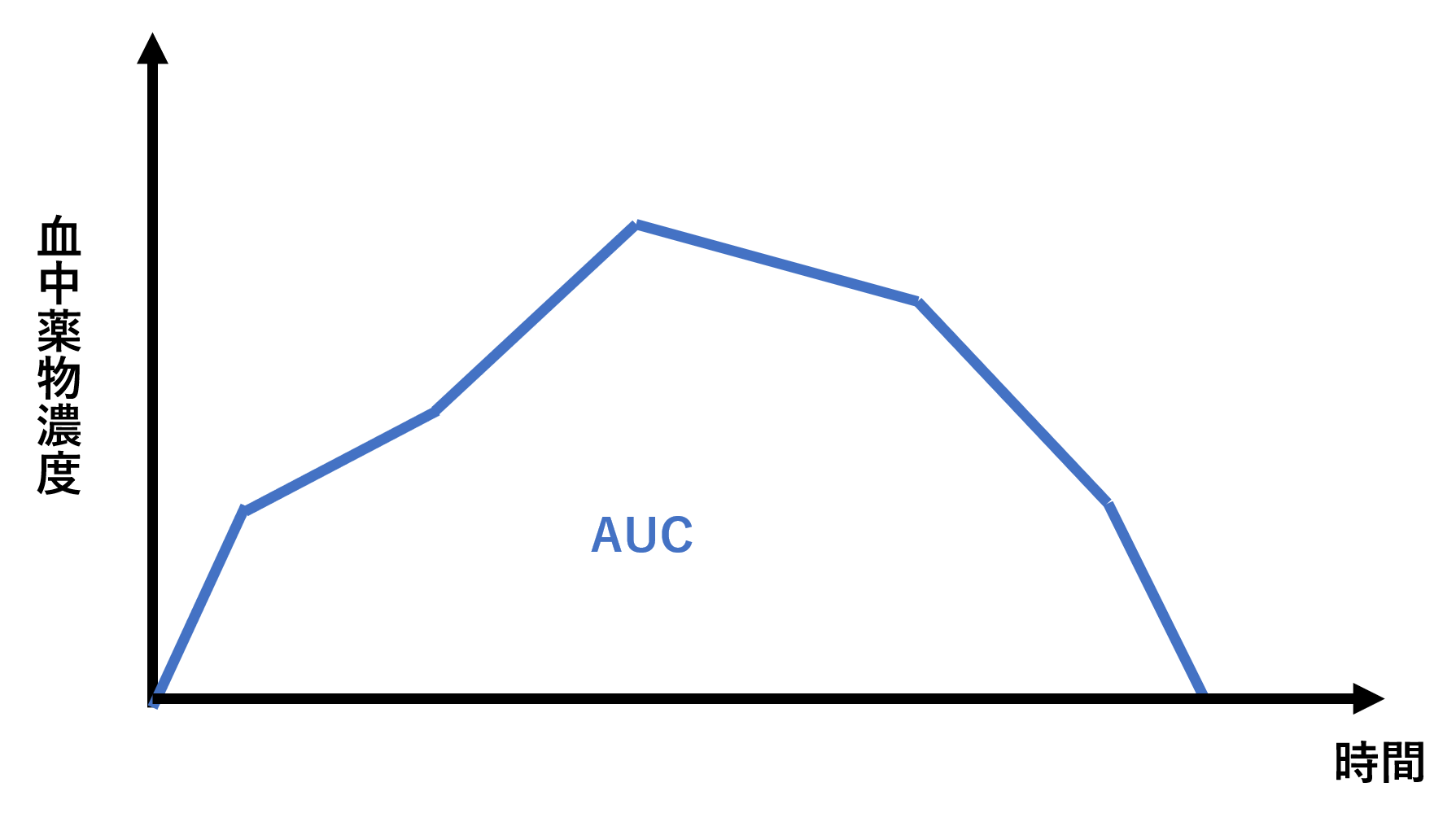 1-コンパートメントモデルの時にもAUCが出てきました。1-コンパートメントモデルでは瞬時に全身に移行するため、下の図のようなAUCが得られました。
