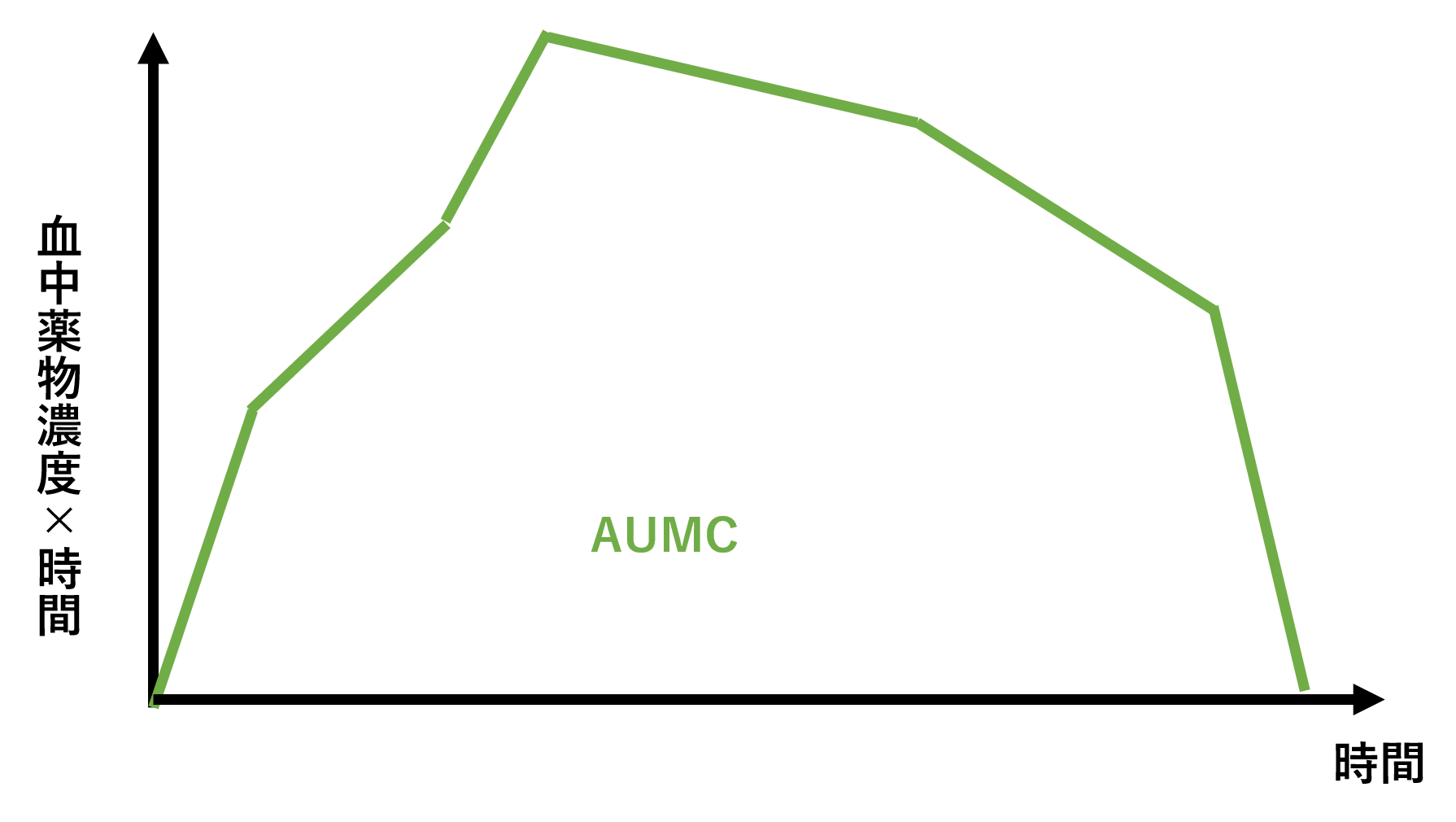 またモーメント解析法では、血中薬物濃度と時間の積を縦軸、時間を横軸で得られた曲線下の面積であるAUMC(Area Under the first Moment Curve)も使われます。