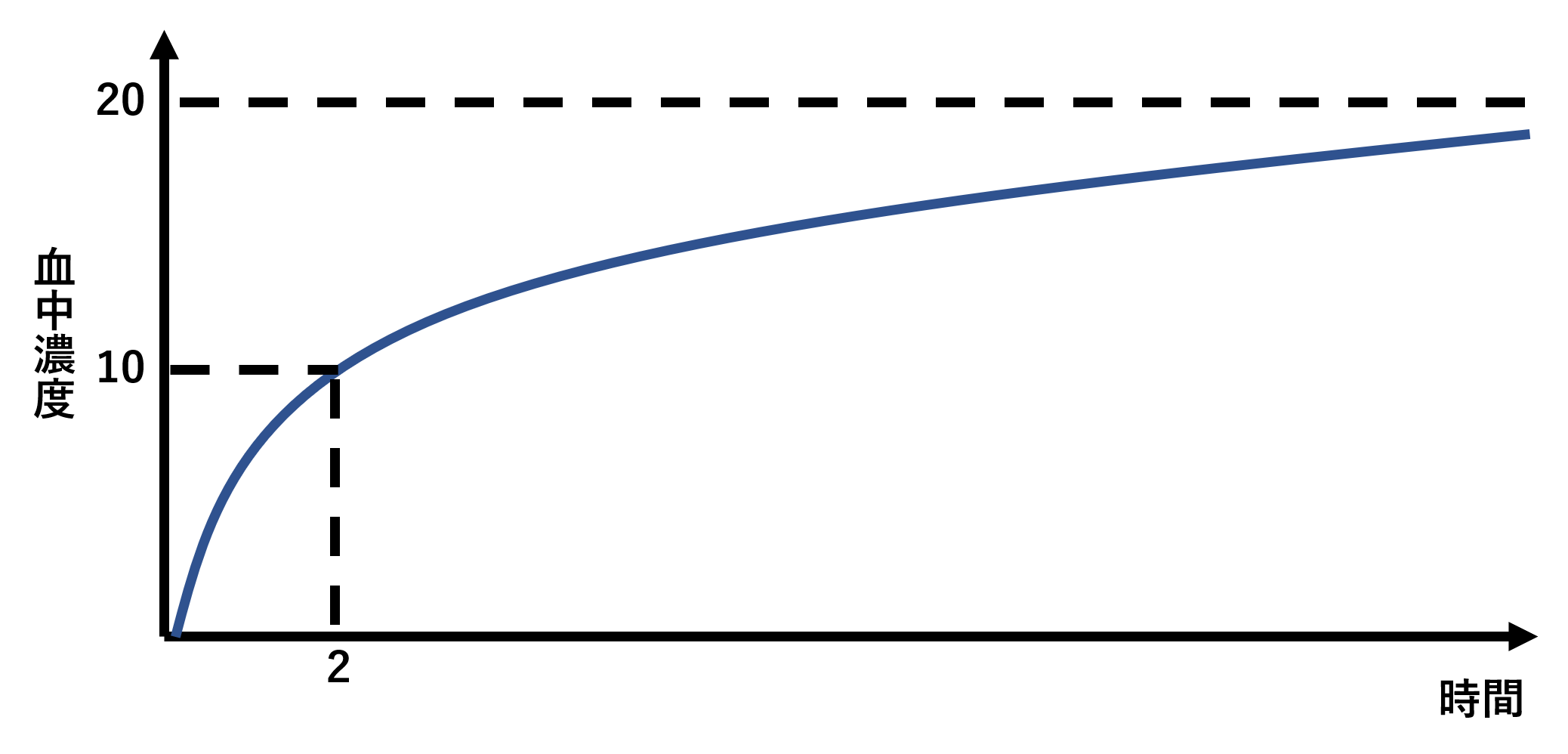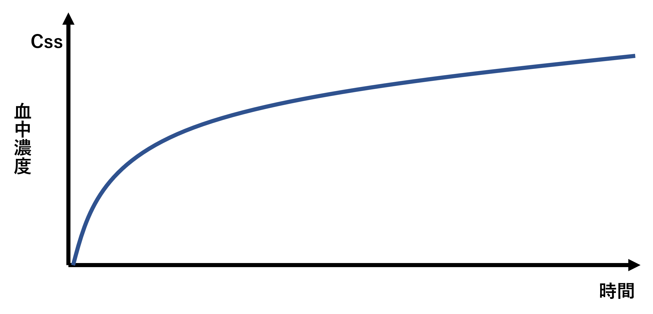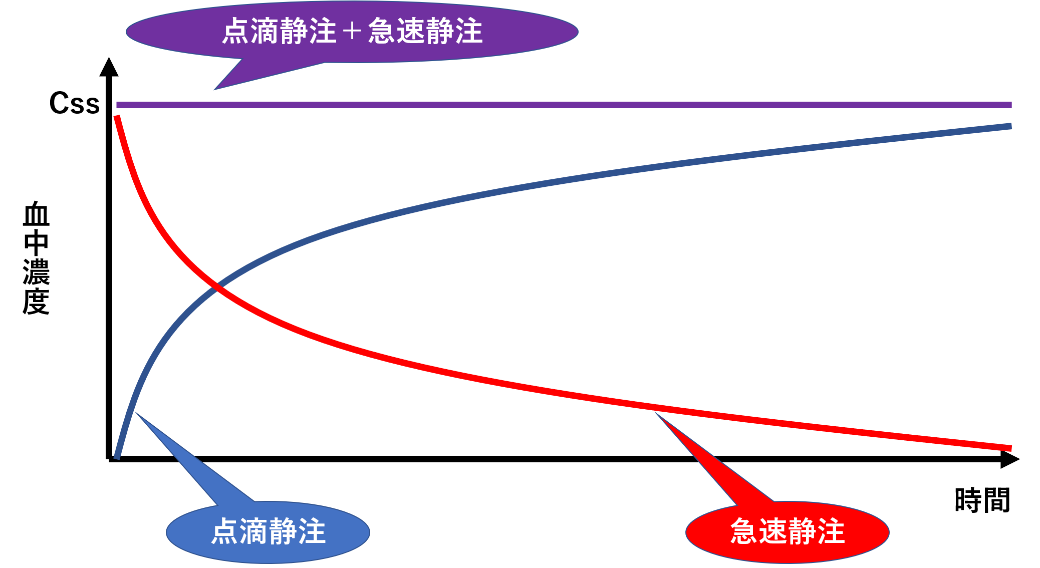 点滴静注を行っていくと、じわじわと血中濃度が上がっていきますが、その一方で薬の消失も始まっていきます。しかし、そのまま投与を続けることで、ある一定の血中濃度となります。