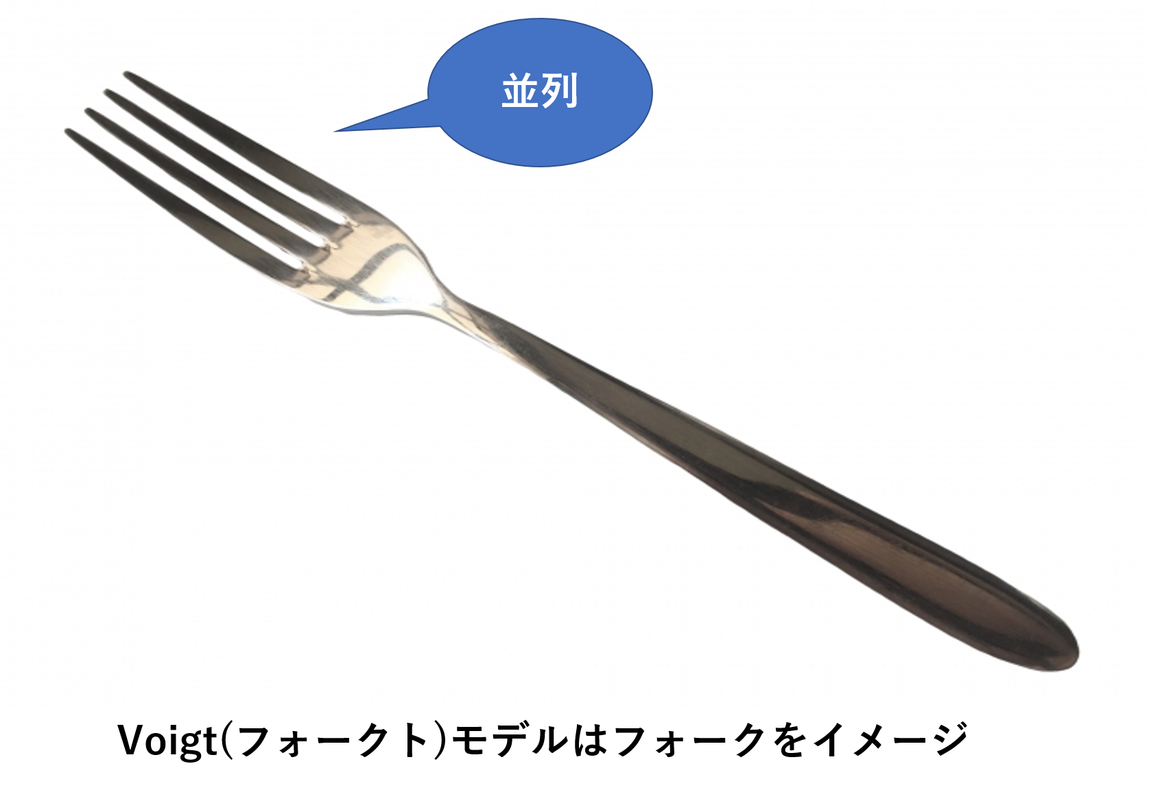 これもどっちがどっちか混同することがあるので、覚えるコツを。Voigt(フォークト)モデルを、フォークと関連づけましょう。フォークの先端部分は、刺すところが並列して並んでますよね。それを並列と結び付けましょう。Maxwell(マックスウェル)モデルは消去法で解けます。