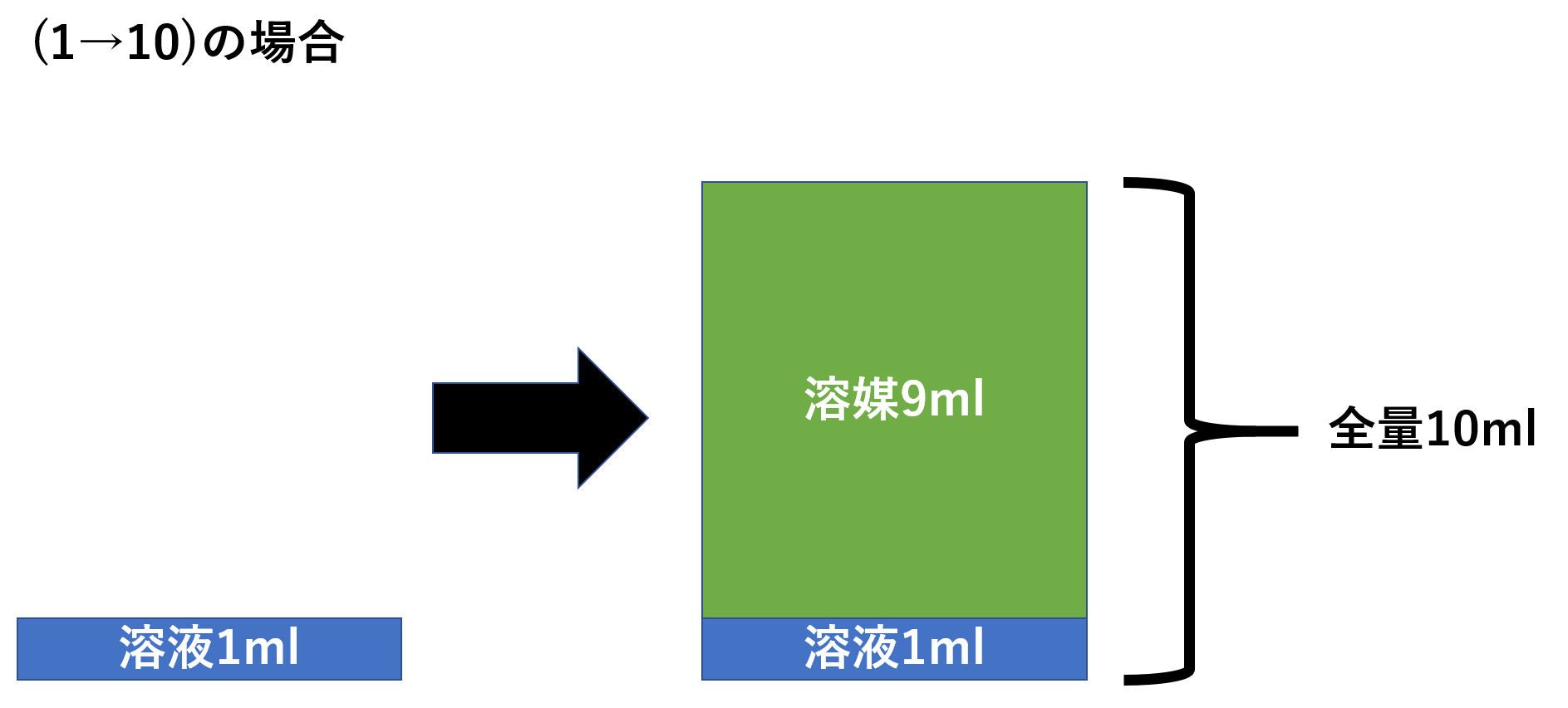 全量というのが、ポイントです。例えば、(1→10)で示された場合は、液体1mlに溶媒9mlを加えて全量を10mlにするということになります。