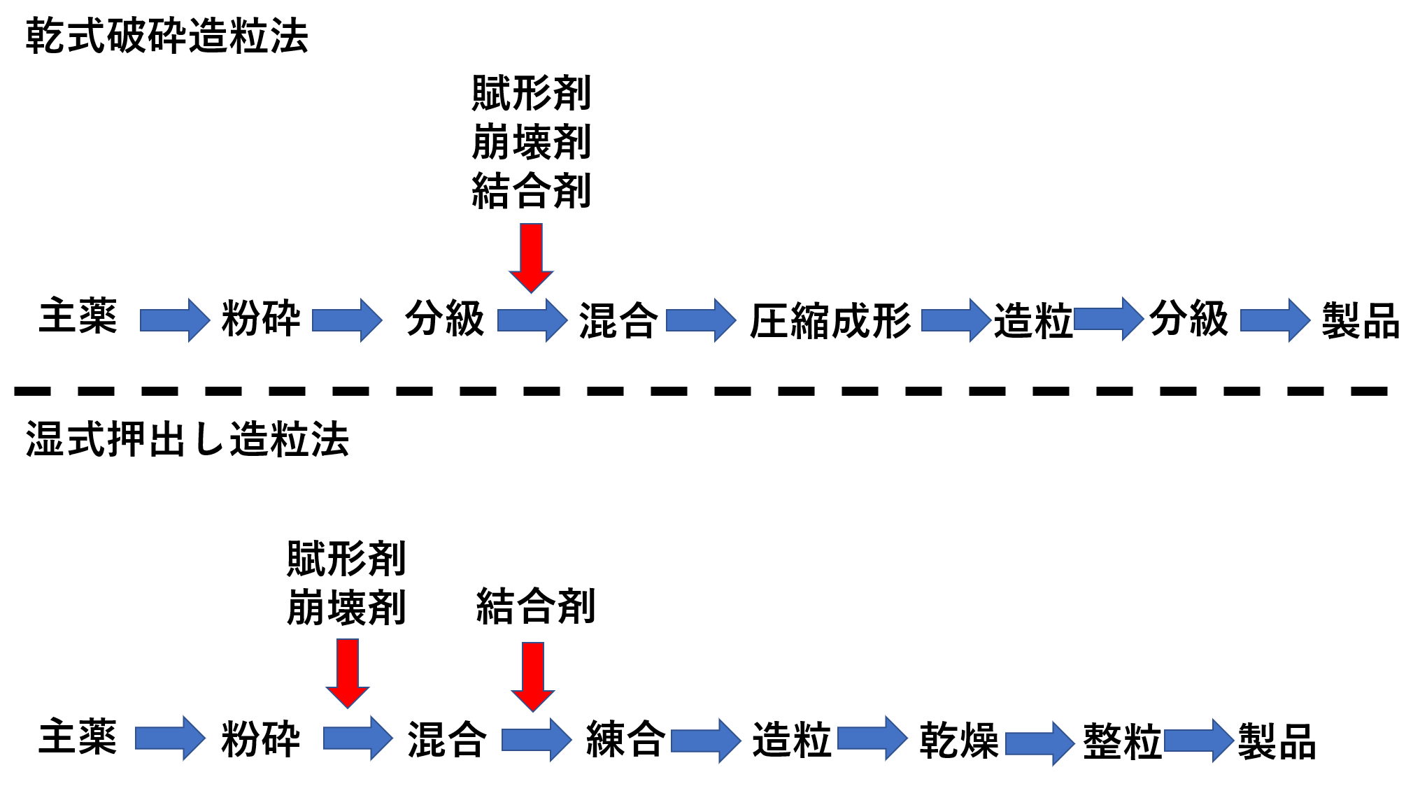 顆粒剤も有効成分に、添加物を加えて造粒していきます。造粒方法には乾式法と湿式法があります。乾式法は乾式破砕造粒法、湿式法は湿式押出し造粒法などが代表例です。