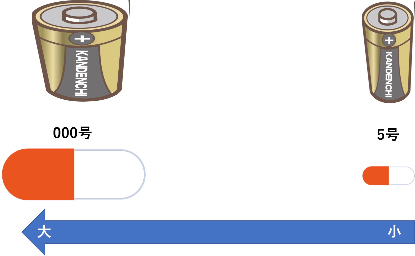 ちなみに、硬カプセルの号数には000号〜5号までの大きさがあります。これは000号の方がカプセルの大きさは大きく、5号が一番小さくなります。忘れそうになったら、電池を思い出してください。単三電池より単一電池の方が大きいですよね。カプセルも電池と同じで数字が小さい方がカプセルの大きさは大きくなります。