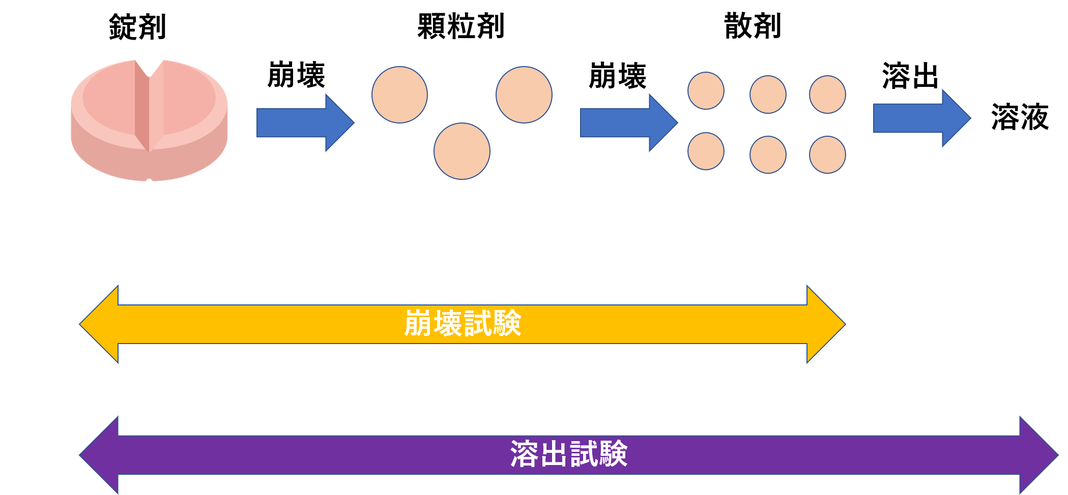 ちなみに先ほどの溶出試験と何が違うかというと、次のイメージです。錠剤が崩れて顆粒剤となります。顆粒剤はさらに崩壊して散剤となります。崩壊した散剤は水に溶けるという流れです。散剤が崩壊試験法に適応されないのは、すでに崩壊しているからです。