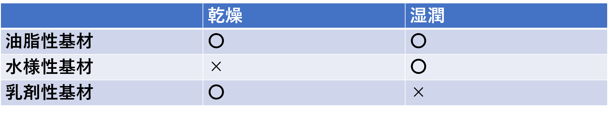 水様性基剤は、分泌物を吸着しやすく、水に落ちやすいという特徴を持ちます。そのため、湿潤している皮膚に適しています。