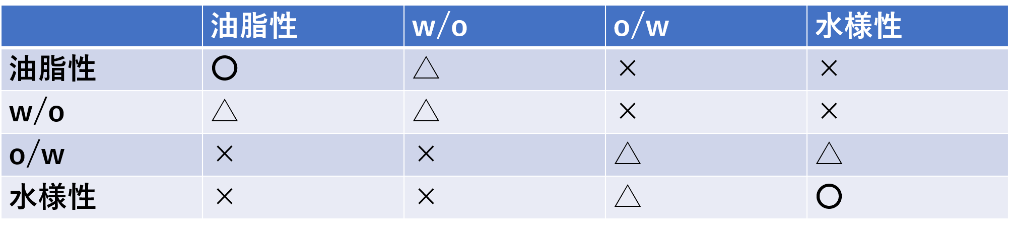 同じ基剤同士であれば、基本的に混合は問題ないです。しかし、他の種類の基材と混合する時は注意が必要となります。一般的には以下のようになります。