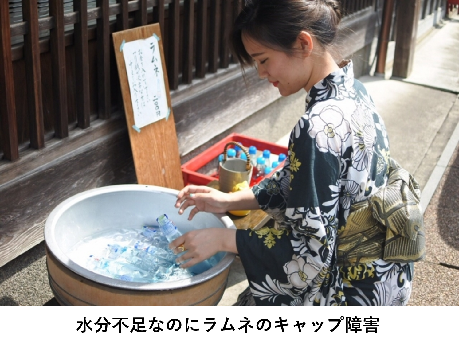 イメージ作りの物語を。水分不足で今すぐラムネが飲みたいのに、ラムネのキャップに障害が起こり飲めないという悲劇的な状況です。