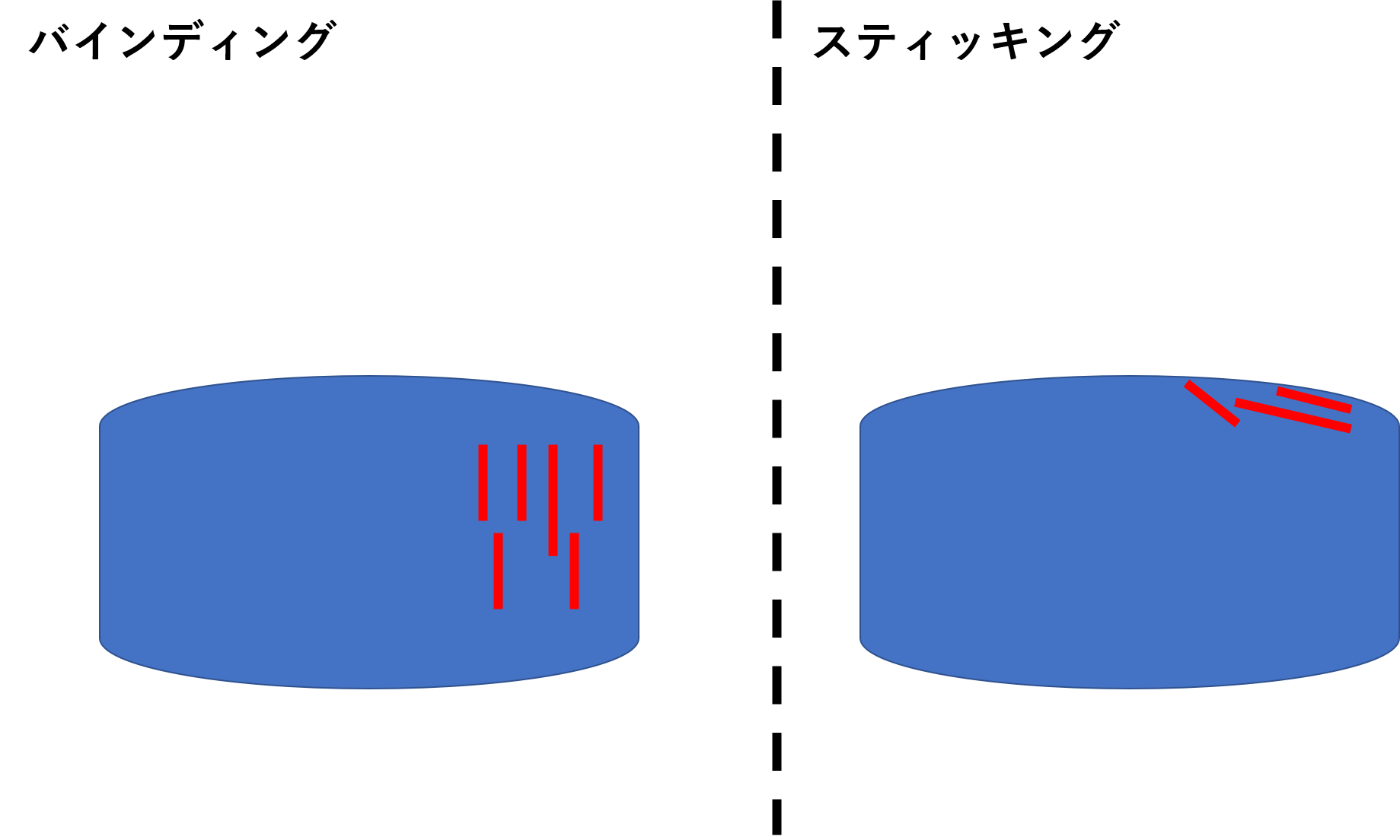 バインディングはbind(縛る)をイメージしましょう。縛ると跡が残ったり傷が残ったりしますよね(意味深)。スティッキングはsticking(粘着)から、杵に付着してはがれてしまうことをイメージしましょう。