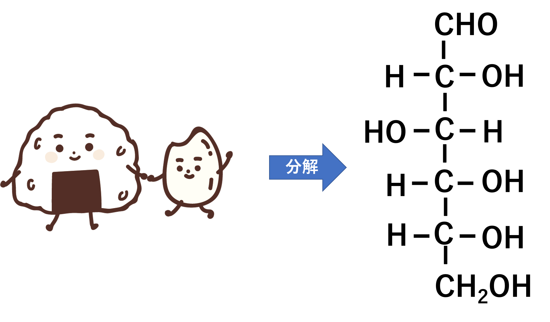 私たちが米を食べると、唾液や膵液に含まれるα-アミラーゼ、小腸粘膜に存在するα-グルコシダーゼなどの酵素によって、先ほどの単糖類であるグルコースにまで分解されます。