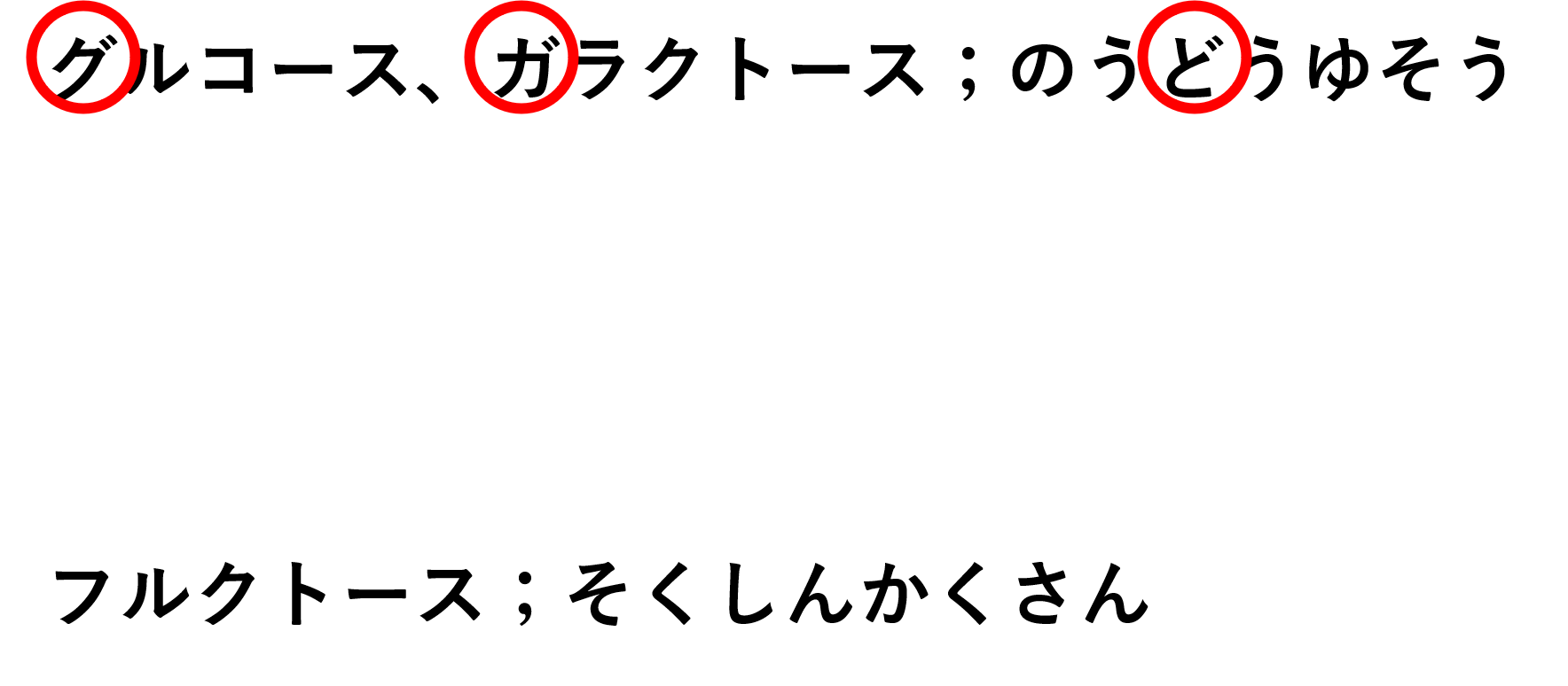 国家試験では、何の糖が何の輸送で吸収されるかを問われることがあります。そのため、グルコースとガラクトースが能動輸送であることを抑えましょう。覚え方は、「ぐ」ルコースと「が」ラクトースはのう「ど」うゆそうと濁点つながりで覚えます。フルクトースは促進拡散は濁点入っていませんね。