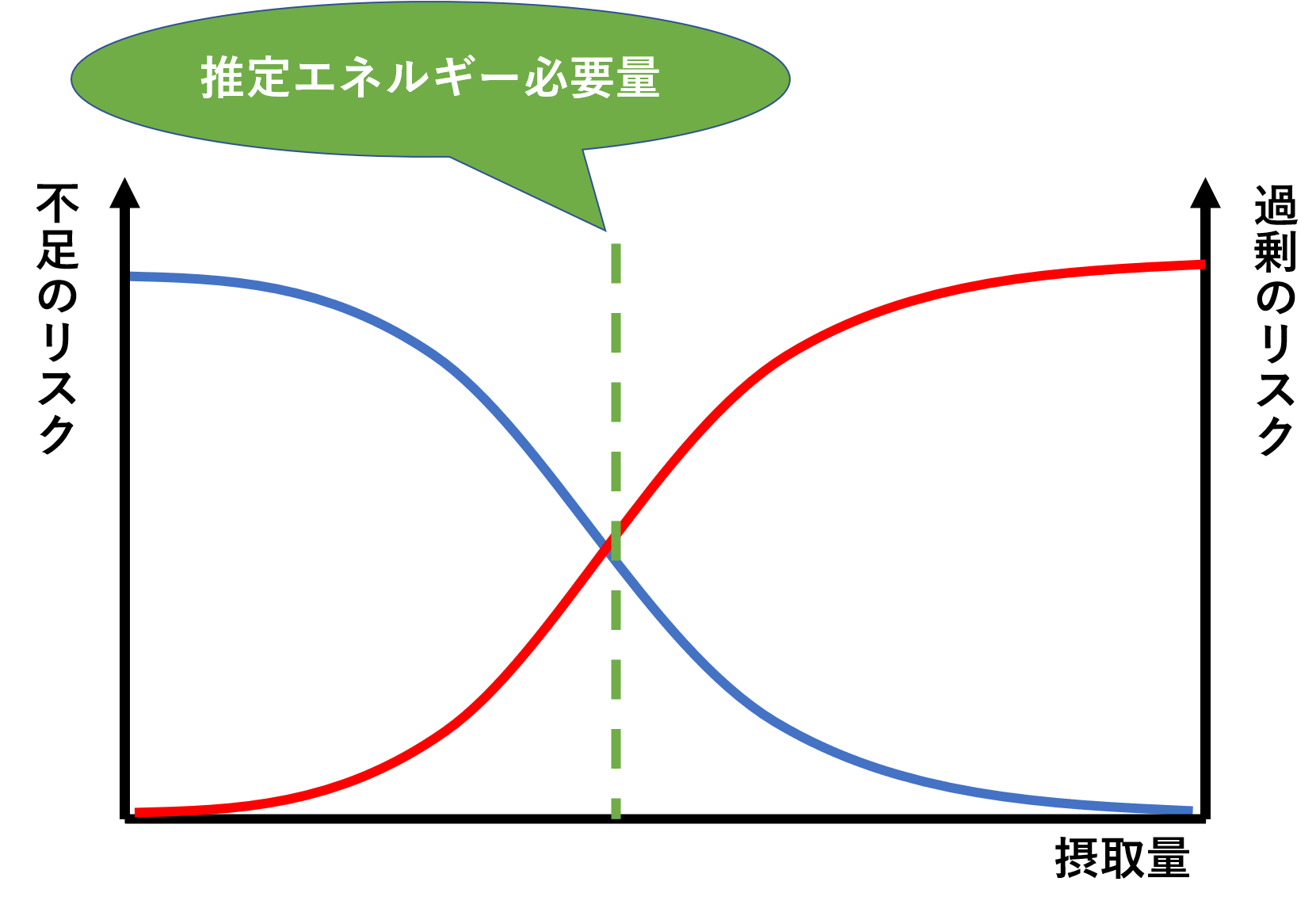 この図からわかるように、栄養素の摂取不足に関する項目は推定平均必要量、推奨量、目安量です。推定平均必要量だけだと十分な活用ができないため、推奨量が存在します。さらに推定平均必要量と推奨量が設定できない栄養素については目安量が存在しています。