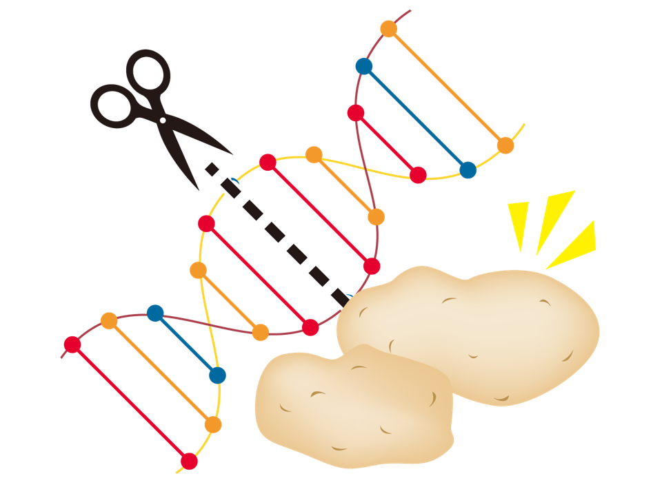 こういった時に出てくるのが遺伝子組み換え食品です。除草剤に強い遺伝子を持ってきて、それをこのデリケートな植物に組み込んでやります。そうすると除草剤に強い植物ができます。除草剤に強い植物以外にも、害虫に強かったり、栄養素を増やしたり、様々な遺伝子組み換え食品があります。また遺伝子組み換え食品の代表例には、大豆、じゃがいも、トウモロコシなどがあります。