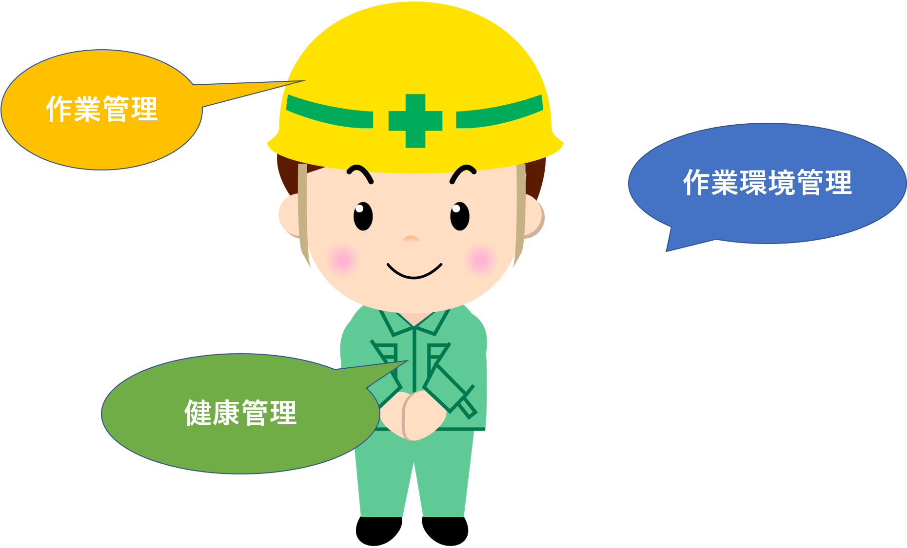 が基本となります。例としては、工事現場で仕事する人をあげると作業環境管理は空気の管理、作業管理はマスクやヘルメットの装着、健康管理は適切な休憩や健康診断などとなります。