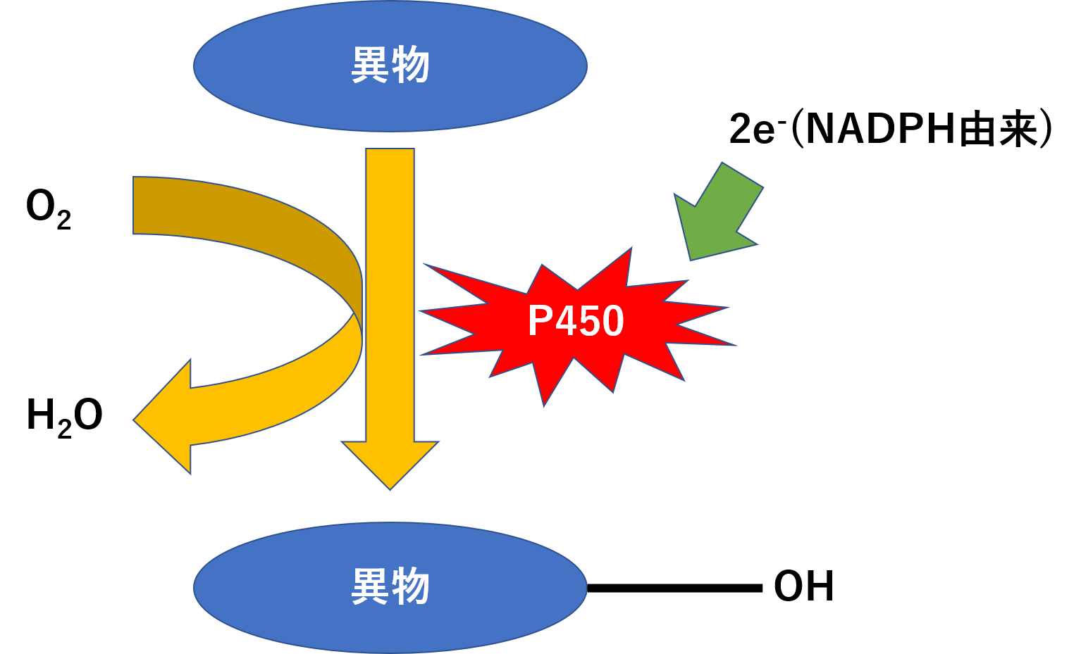 シトクロムP450(cytochrome P450)はCYPと略され、「シップ」と呼ばれます。肝細胞の小胞体に多く存在し、活性中心にヘム鉄をもつヘムタンパク質です。CYPが酸化・還元に関わるのはこのヘム鉄があるからです。好気的な条件では酸素を使って、異物などに酸素原子を与えます。逆に嫌気的な条件では還元反応を触媒することもあります。