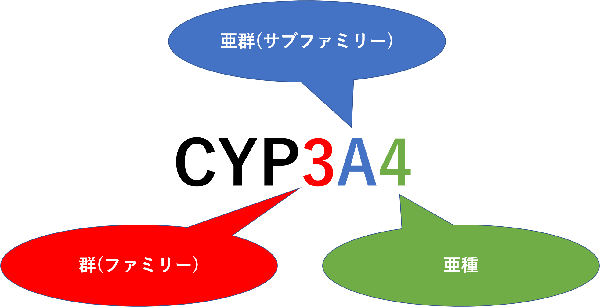 CYPは多くの分子種があり、CYPの後に数字と英字をつけてその分子種を表します。最初の数字は群(ファミリー)、次の英字が亜群(サブファミリー)、最後の数字が亜種を示します。