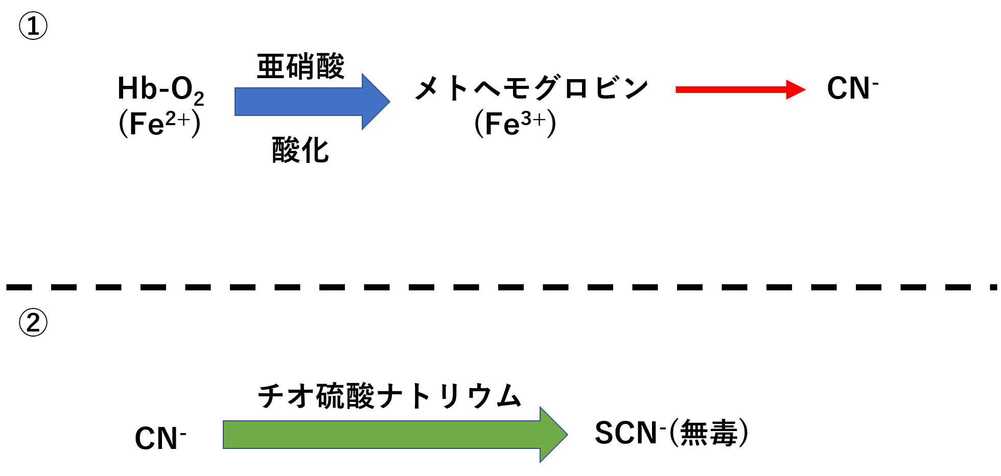 まず1ですが、亜硝酸アミル、亜硝酸ナトリウムなどの亜硝酸を投与することで、ヘモグロビン(Fe2+)がメトヘモグロビン(Fe3+)となります。シアンはFe3+にくっつくという性質があったため、メトヘモグロビンのFe3+とくっつきます。このようにシトクロムcオキシダーゼの代わりにメトヘモグロビンがおとりとなってシアンにくっついてくれます。