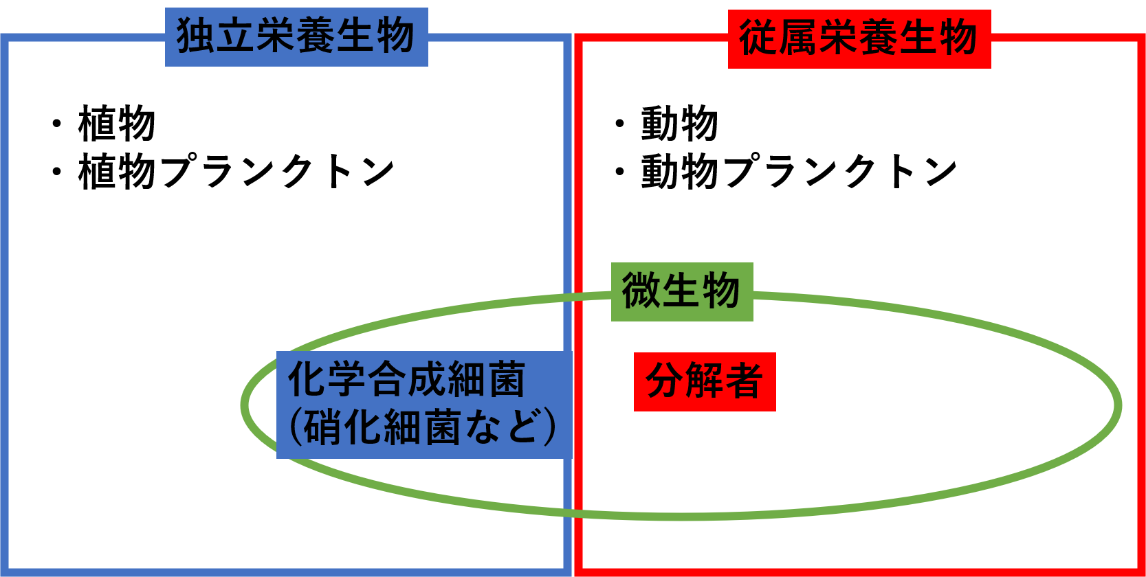 この図からも硝化細菌が例外であることがわかります。硝化細菌は光合成は行わないけれども化学合成を行う独立栄養生物です。「硝化」というワードが出てきたように、生態系を生産者→消費者→分解者→生産者→消費者→分解者・・・・という流れで循環させるには窒素の流れが重要となってきます。