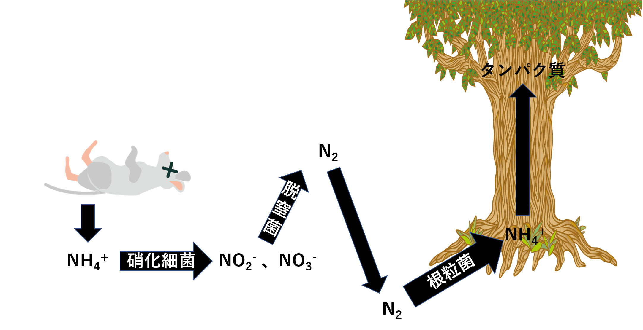 生物が死ぬとNH4+が発生します。このNH4+を硝化細菌がNO2-やNO3-へと酸化します。これらのNO2-やNO3-はさらに、脱窒菌よ呼ばれる微生物により窒素まで還元されます。