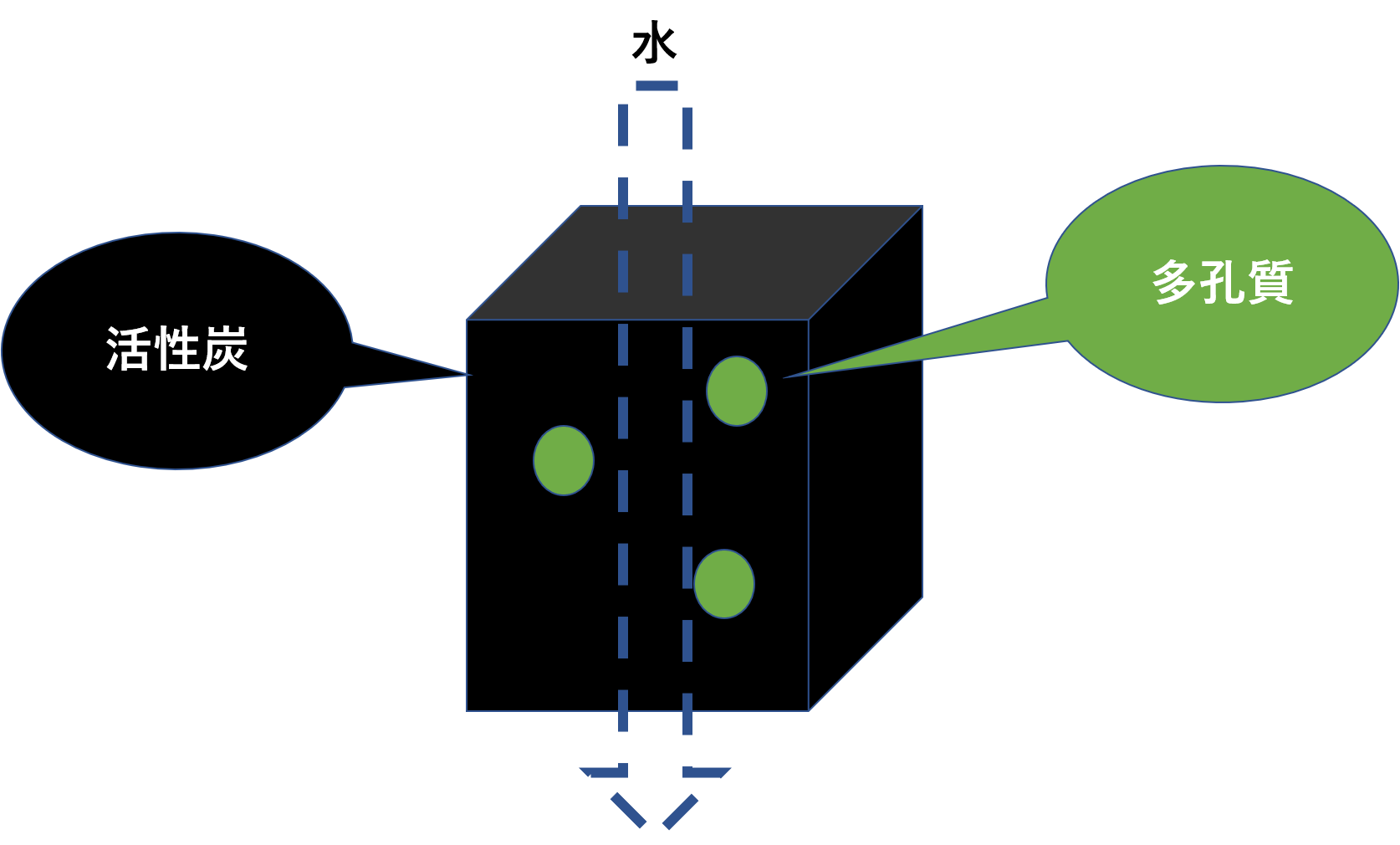 活性炭は医療用だけでなく、下駄箱の臭い取りなど様々な場面でも使われますよね。水の中にある臭いや色の原因となる有機物質が、活性炭の多孔質に取り込まれ吸着することで取り除かれます。