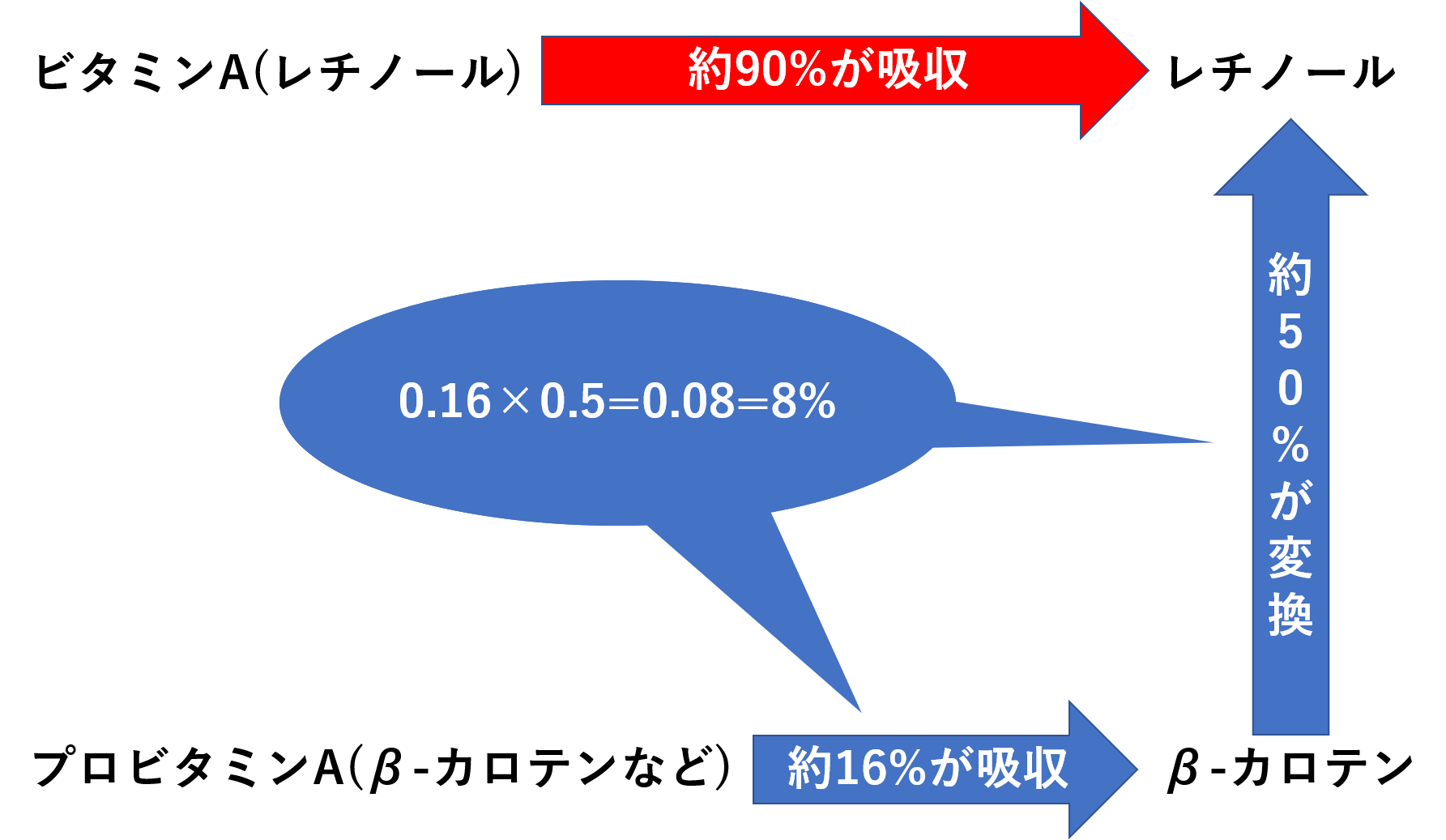 プロビタミンAは体内に吸収された後、ビタミンAに変化します。プロビタミンAは必要量だけビタミンAに代わるため、過剰摂取の心配は少ないとされています。植物性由来のものは約16%が吸収され、その後約50%がレチノールに変換されるため、摂取量の約8%が作用すると考えられています。