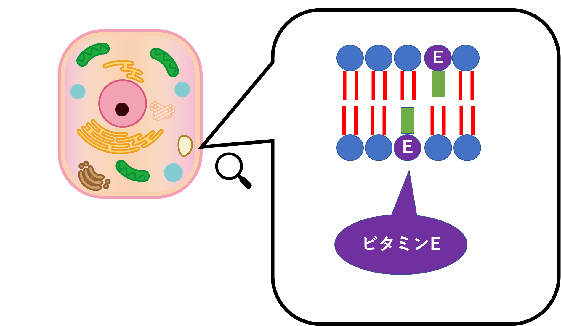 ビタミンEは生体内の大きな細胞から小さな細胞まで、多くの生体膜の安定化に関わり、細胞の機能を正常な状態に維持しています。