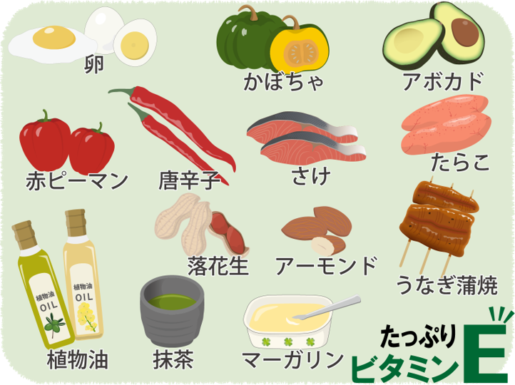 などの症状が起こると言われています。ただ健康な人であれば、食事でビタミンEをほとんどとっていなくても、明らかなビタミンE欠乏症の発生はまれと言われています。