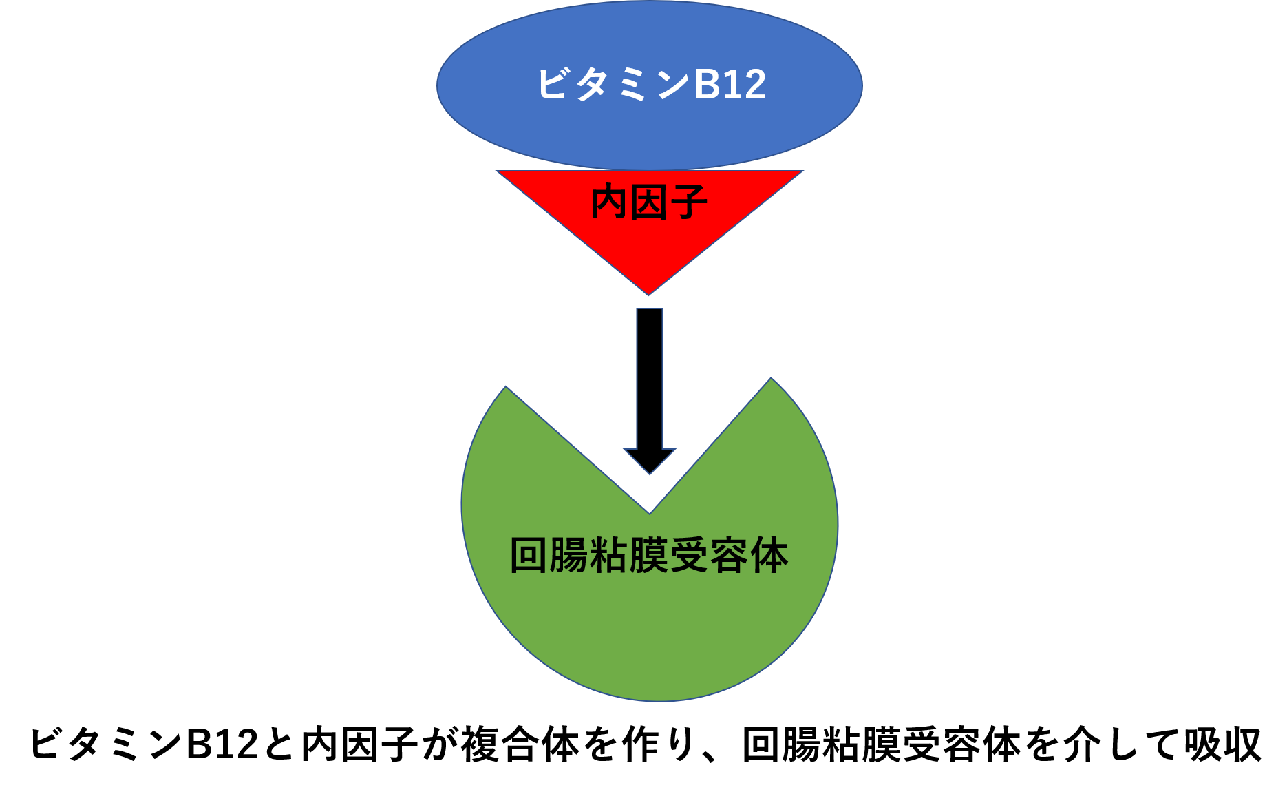 遊離したビタミンB12は胃壁細胞から分泌される内因子と呼ばれる糖タンパクとくっつき、内因子とビタミンB12が複合体となります。複合体となったビタミンB12は回腸粘膜受容体を介して吸収されます。これらの理由から胃や腸を手術で切除した場合では、うまく吸収されない可能性があります。