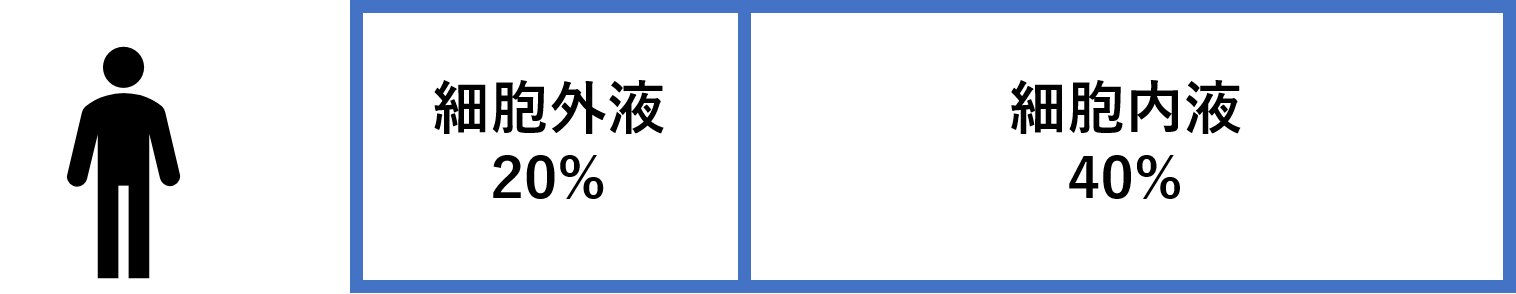 この60%の内訳をみていきます。20%は細胞外液、40%は細胞内液となります。