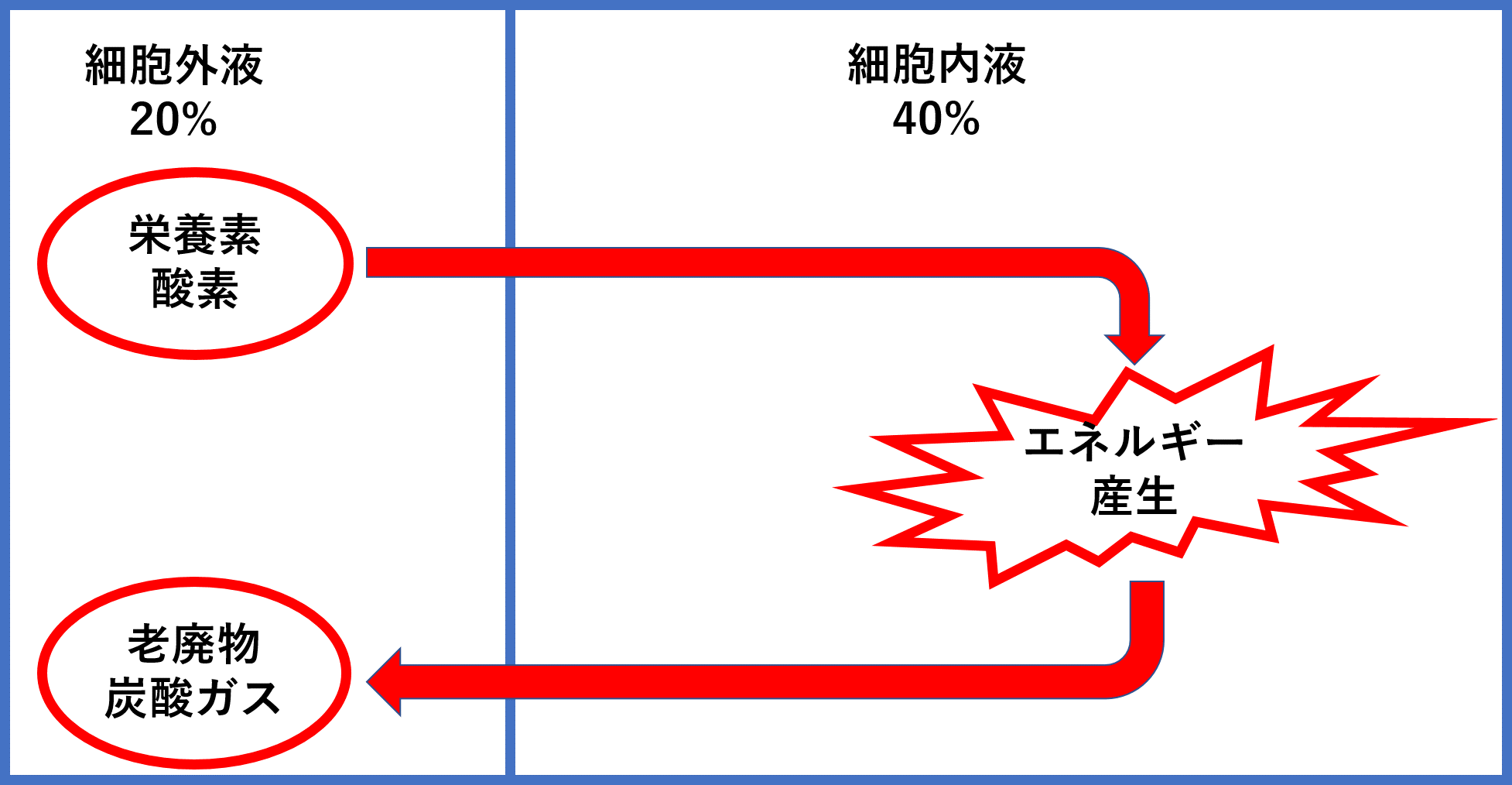 流れとしては細胞外液(栄養素、酸素を含む)→細胞内液(エネルギーなど産生)→細胞外液(老廃物、炭酸ガスを含む)となります。